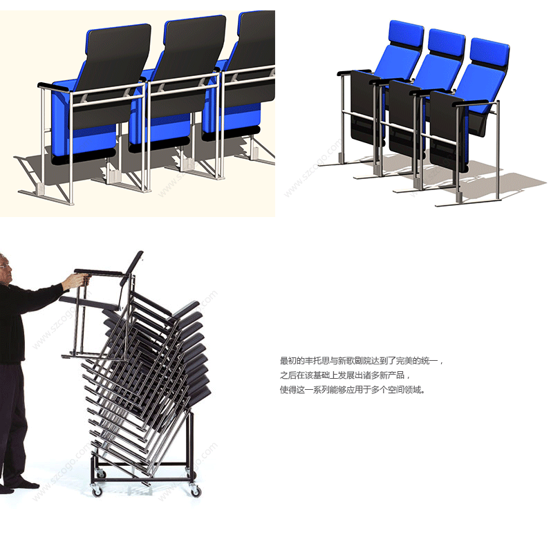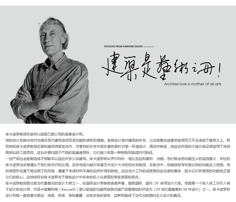 该系列始于库卡波罗1992年为芬兰赫尔辛基新歌剧院的专门设计,简洁、舒适、洗练、高雅,充分体现了现代北欧设计的特点。它有着强烈的个性和近乎数学般的精确造型,人体工学质量是借助于不同科学试验模型进行研究的,在结构、功能与审美形式上的发展与协调是近乎完美的。