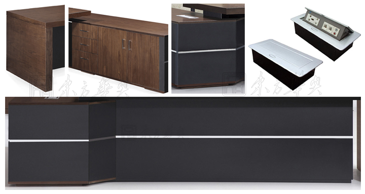 ※ 上图中厚实,稳重的班台侧脚搭配着拼接侧柜,以及可选择的手动电动线盒,前挡板及外围板统一深灰色油漆加铝合金饰边条。