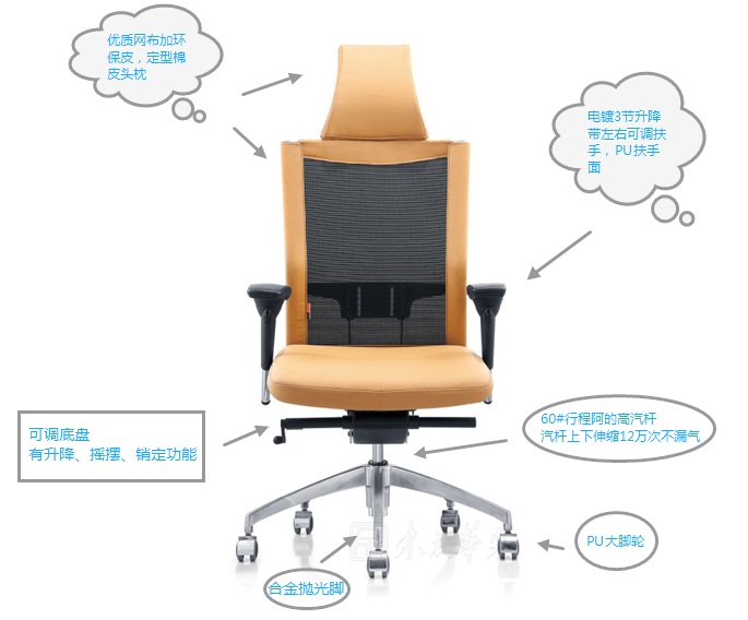 B:合金抛光脚,PU大脚轮,60#行程阿的高汽杆,汽杆上下伸缩12万次不漏气。