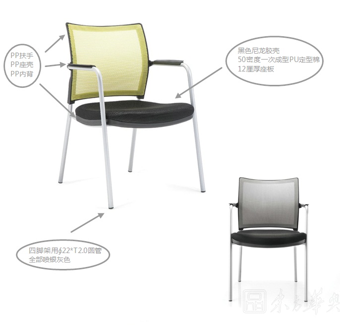 A:黑色尼龙胶壳,50密度一次成型PU定型棉,12厘厚座板,PP扶手、PP座壳和PP内
