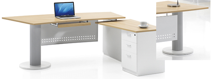 ※ 一个简约而高效的空间设计方案,为现代日新月异的工作环境营造截然不同的办公格局。设计师将粗矿的圆柱脚搭配这浅色调的三胺板,细腻有力的线条与桌脚设计体现简约和美学的精髓。