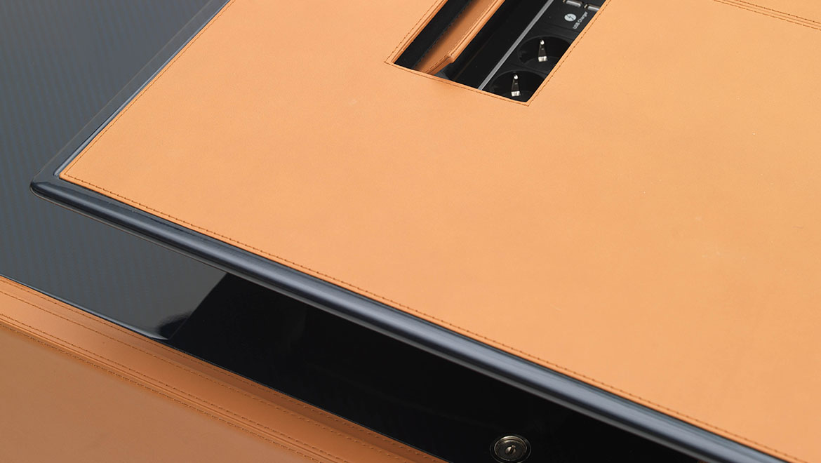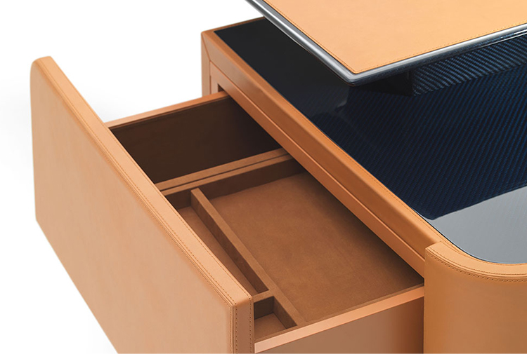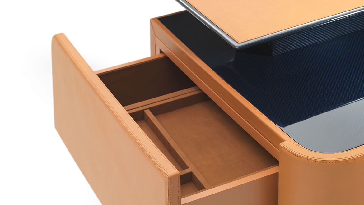 The rectilinear top extends lengthwise from the cabinet, seamlessly sloping to form the opposite base. A re-design of the classic desk, made possible by the outstanding performance of carbon for the structure.