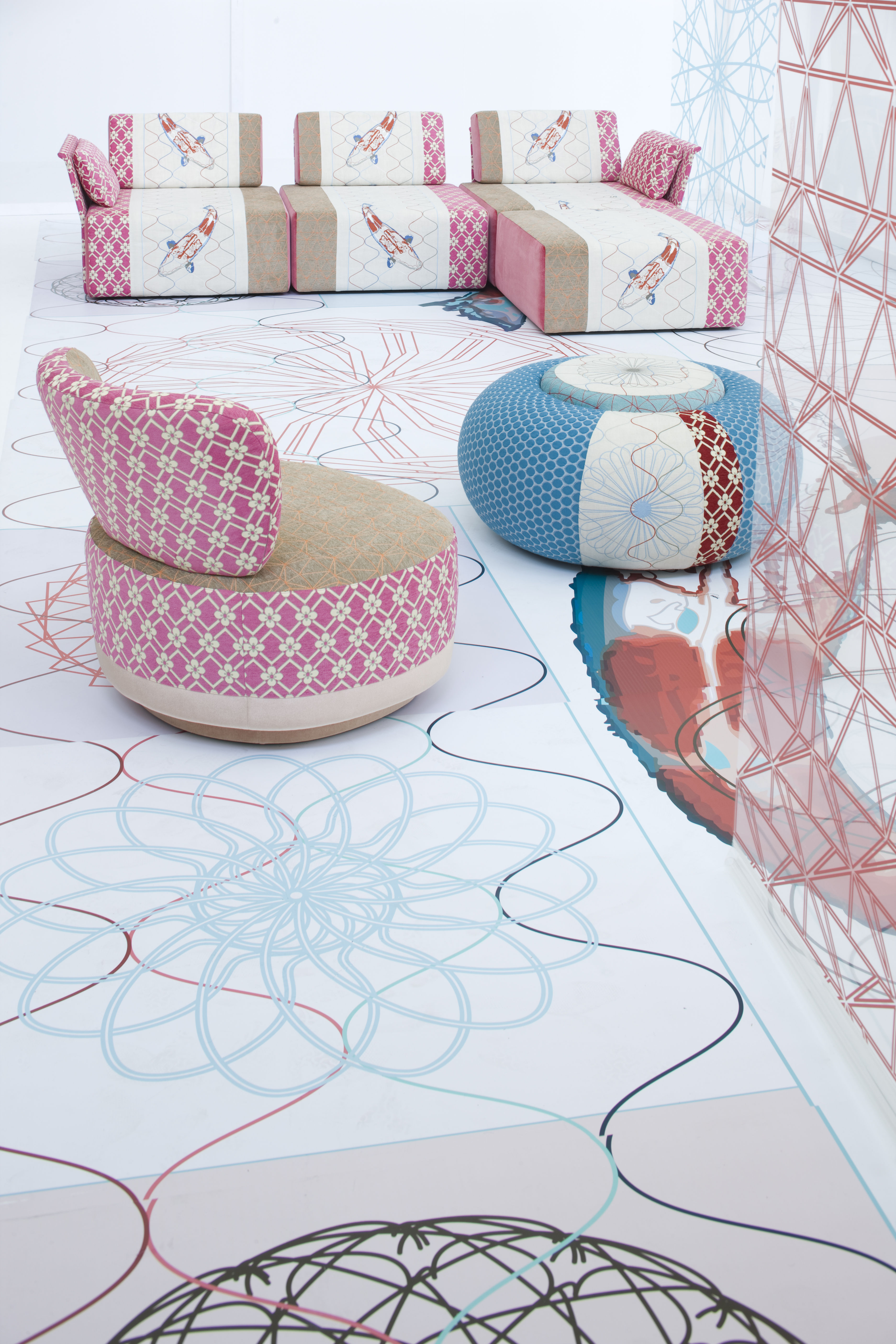寿司收集、Karkaoma,Juju, Donut, Joy, block seat,东方的象征意义,花卉图案和数字网格:集合中发现其身份分层的丰度。有各种各样的输入和刺激的积累,一种从建筑形式到民间传说的各种图像的疯狂流动。传统的,未来主义的,数字理性的,三维的,浪漫的,迷幻的兴奋,视觉上的大融合,对空的恐惧,和谐的,不端庄的,精致的,几何的严重…无尽的图像和视觉,既不害怕也不威胁,而是欢迎用户进入一个柔软的,催眠的万花筒。