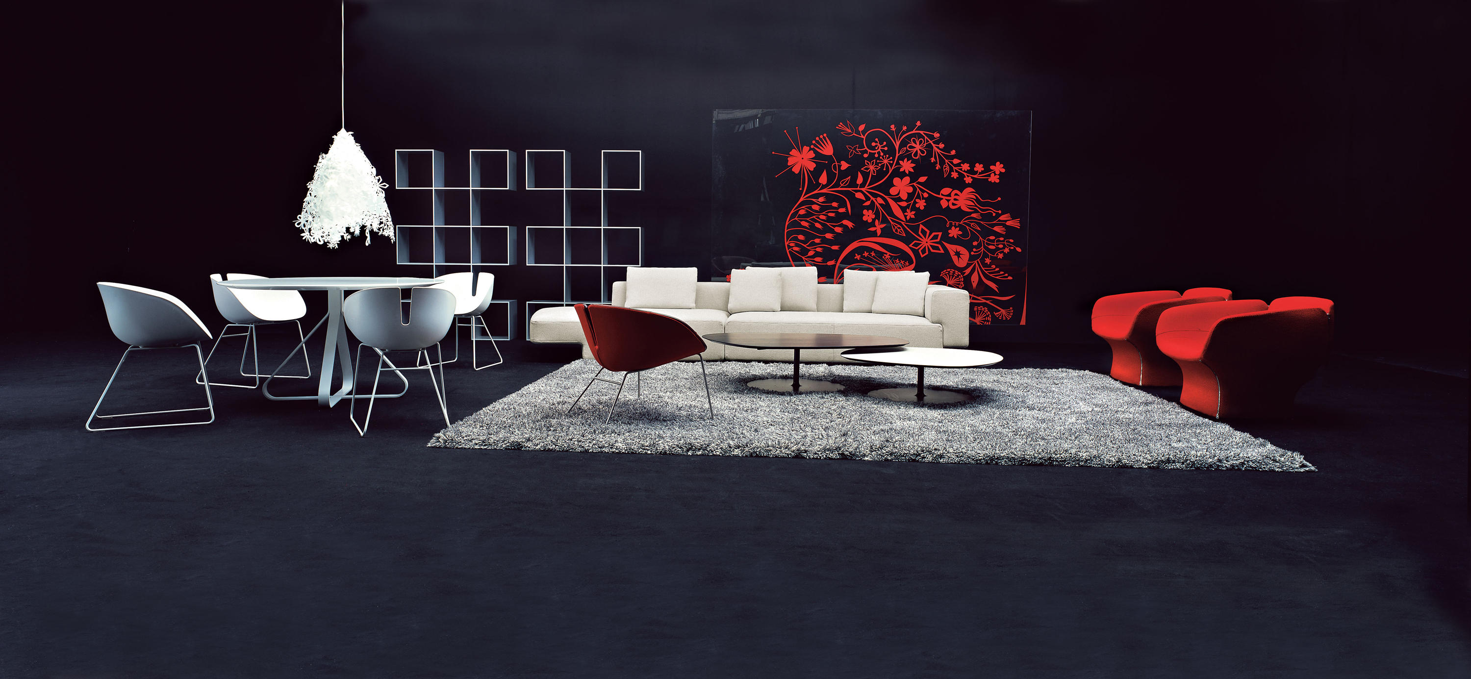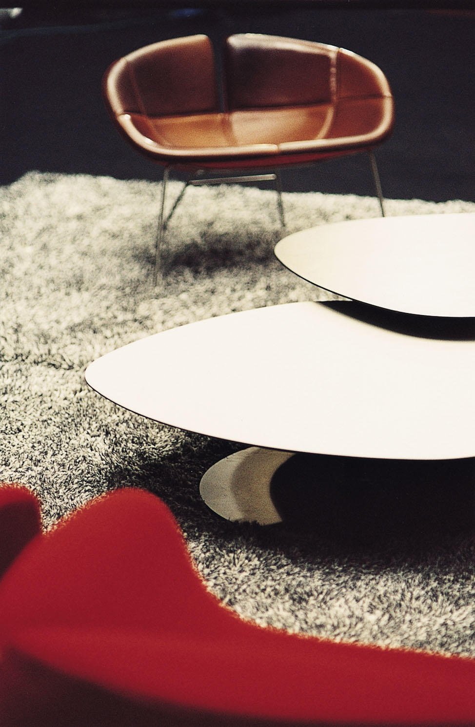 两张桌子,水平的表面,如有机形体的二维投影,相互滑动,重叠。结果是一种不均匀且和谐的结构,由地板的材料和颜色的选择而增强。菲尼克斯,名字来源于阿拉伯神话中的不死鸟,在火焰中死去,从灰烬中涅槃,没有任何痕迹;更确切地说,是科幻小说——《星际迷航》中的“菲尼克斯号”。