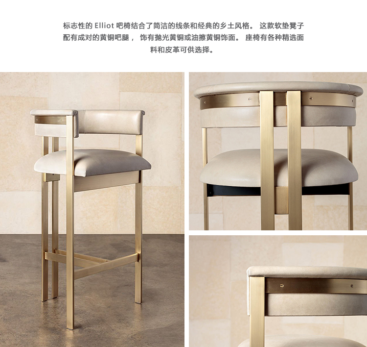 标志性的Elliot吧椅结合了简洁的线条和经典的乡土风格。 这款软垫凳子配有成对的黄铜吧腿,饰有抛光黄铜或油擦黄铜饰面。 座椅有各种精选面料和皮革可供选择。