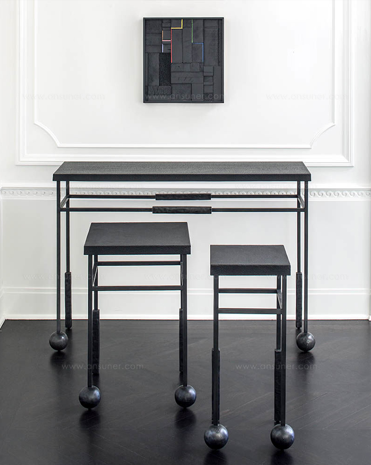 雕塑般的尼姆控制台采用黑色不锈钢制成,具有细长,光滑的铸造方形细高跟腿,手工雕刻铸钢球体和黑色花岗岩顶部。