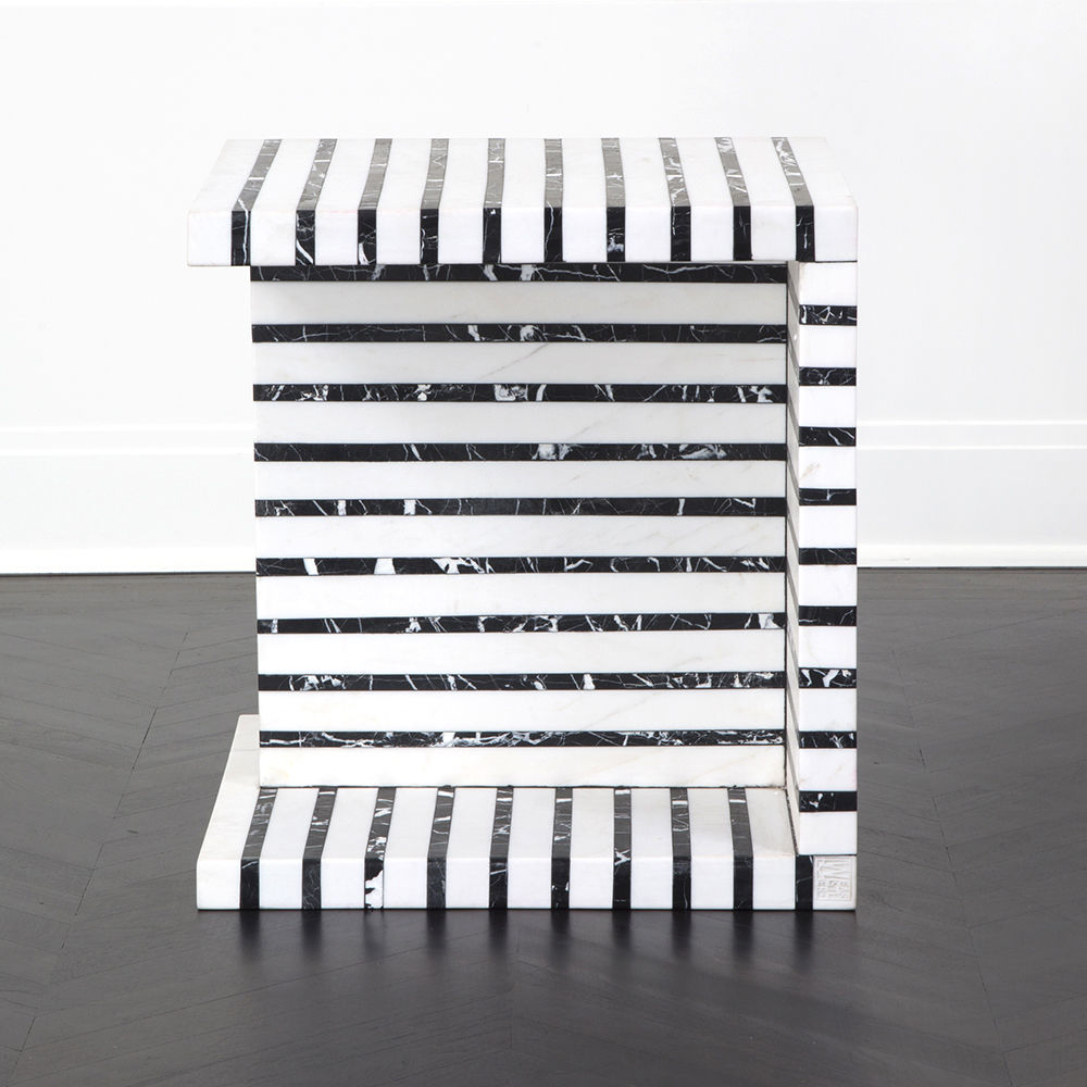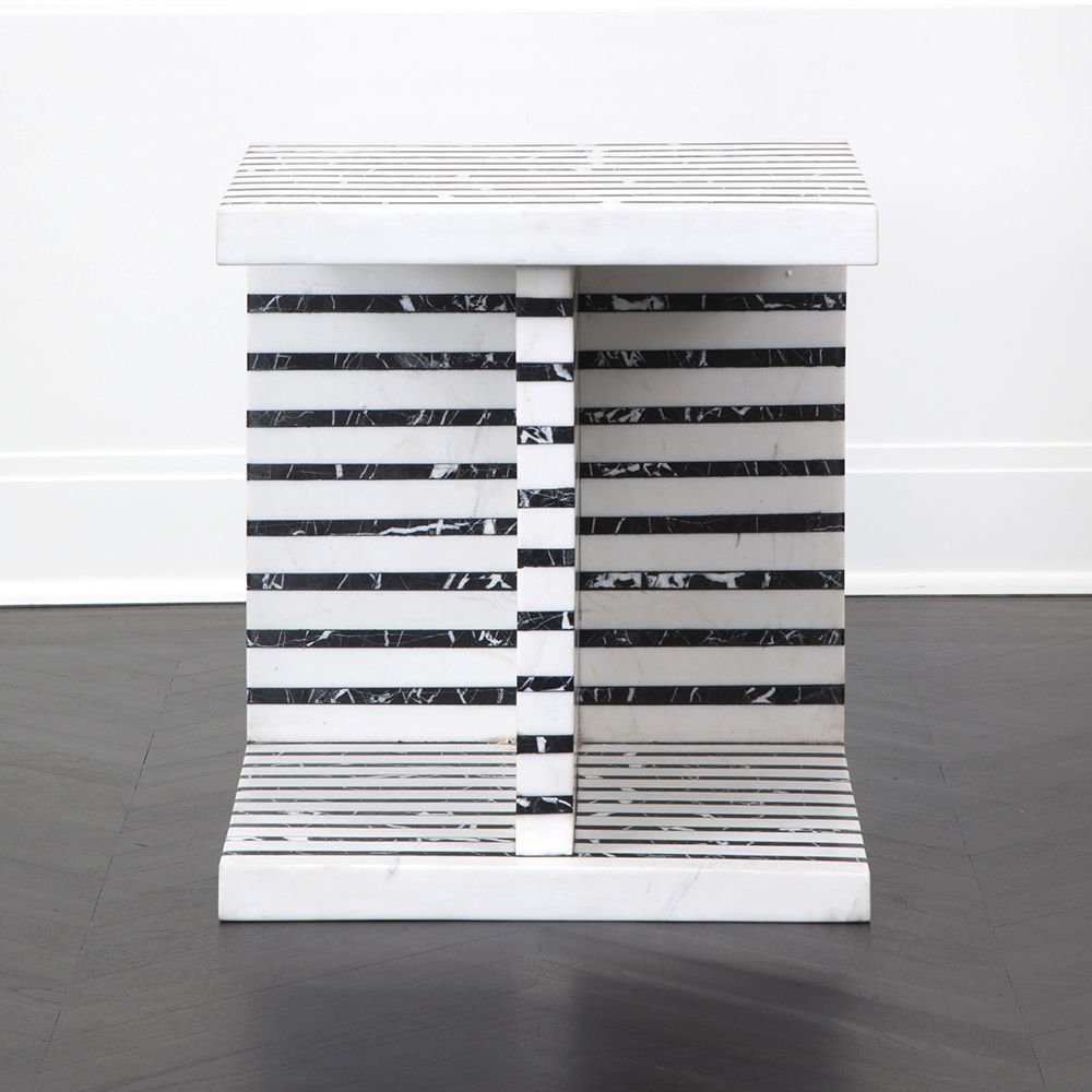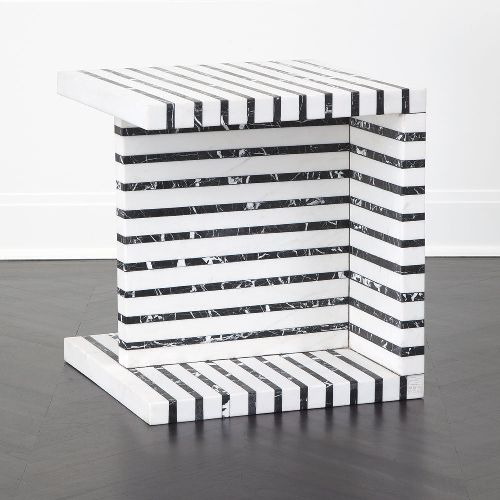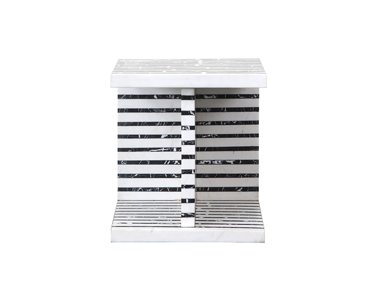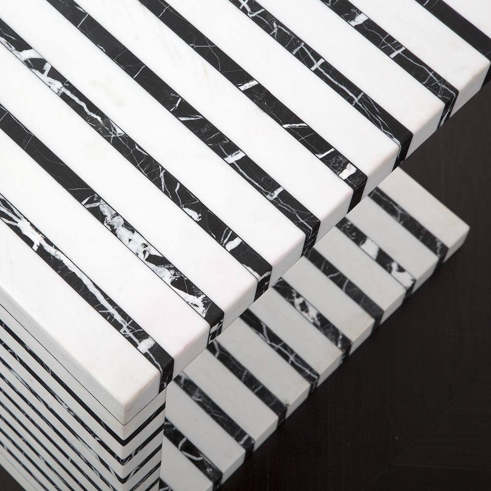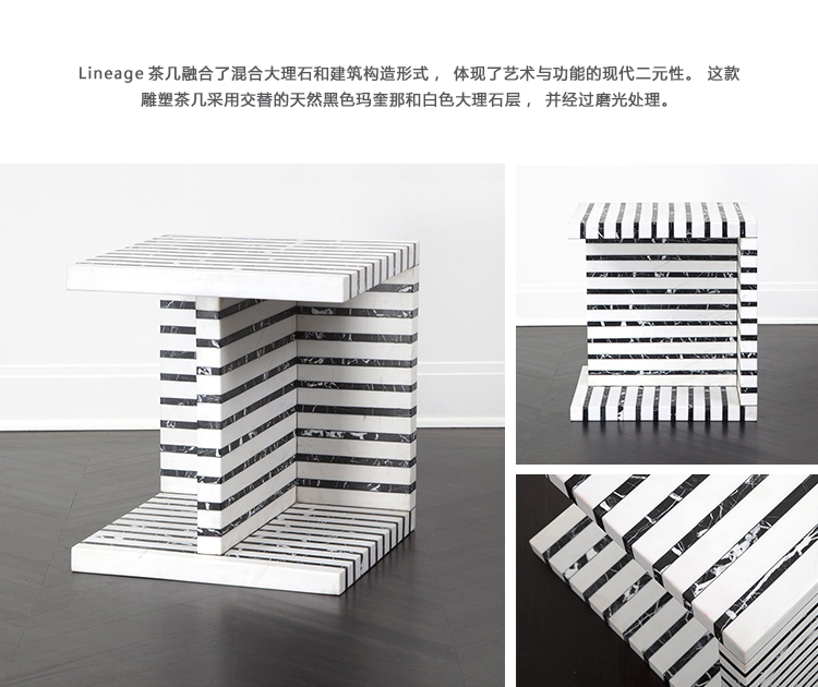 Lineage临时茶几是混合大理石和建筑构造形式的汇合,体现了艺术和功能的现代二元性。 这款雕塑茶几采用天然黑色玛奎那和白色大理石交替层层,经过磨光处理。