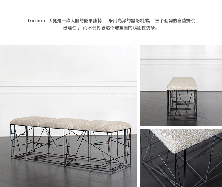 Turmont长凳是一款大胆的图形座椅,采用光泽的黑钢制成。 三个低调的座垫提供舒适性,而不会打破这个雕塑座的戏剧性线条。