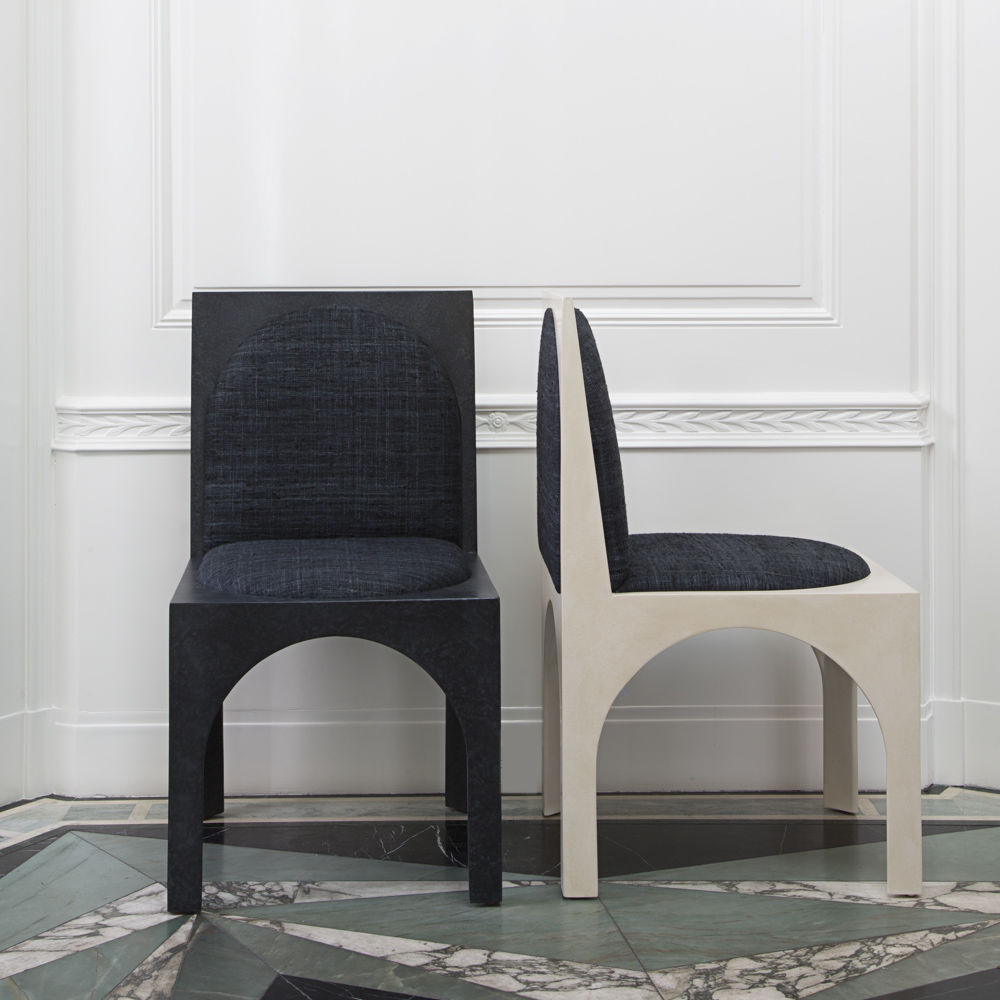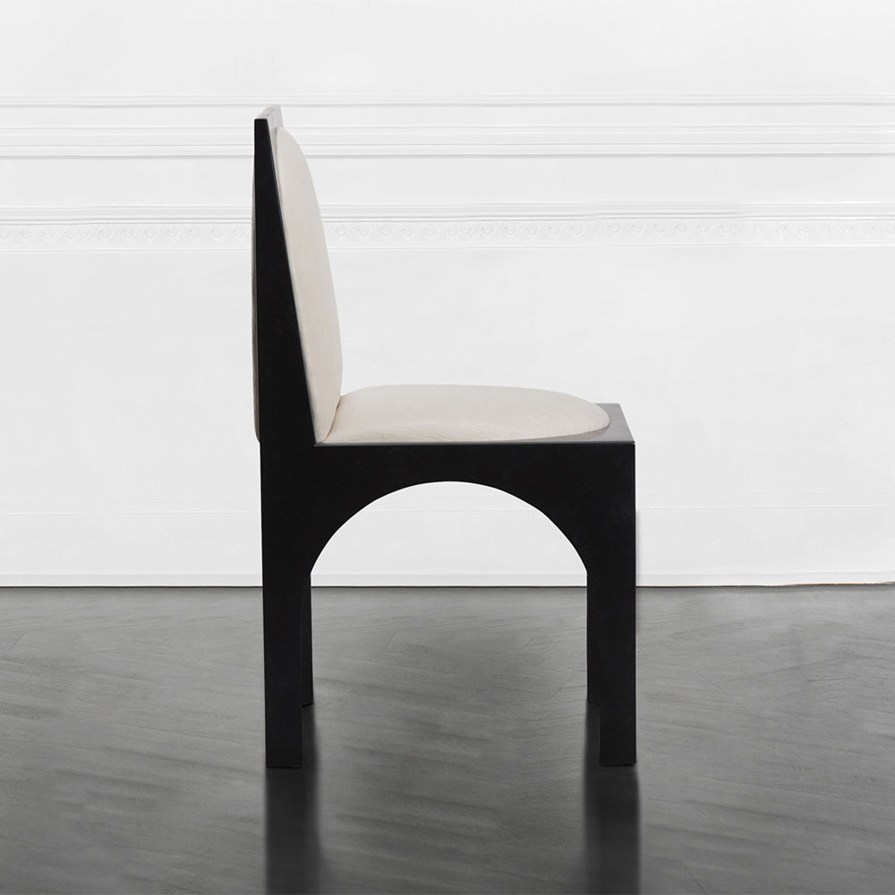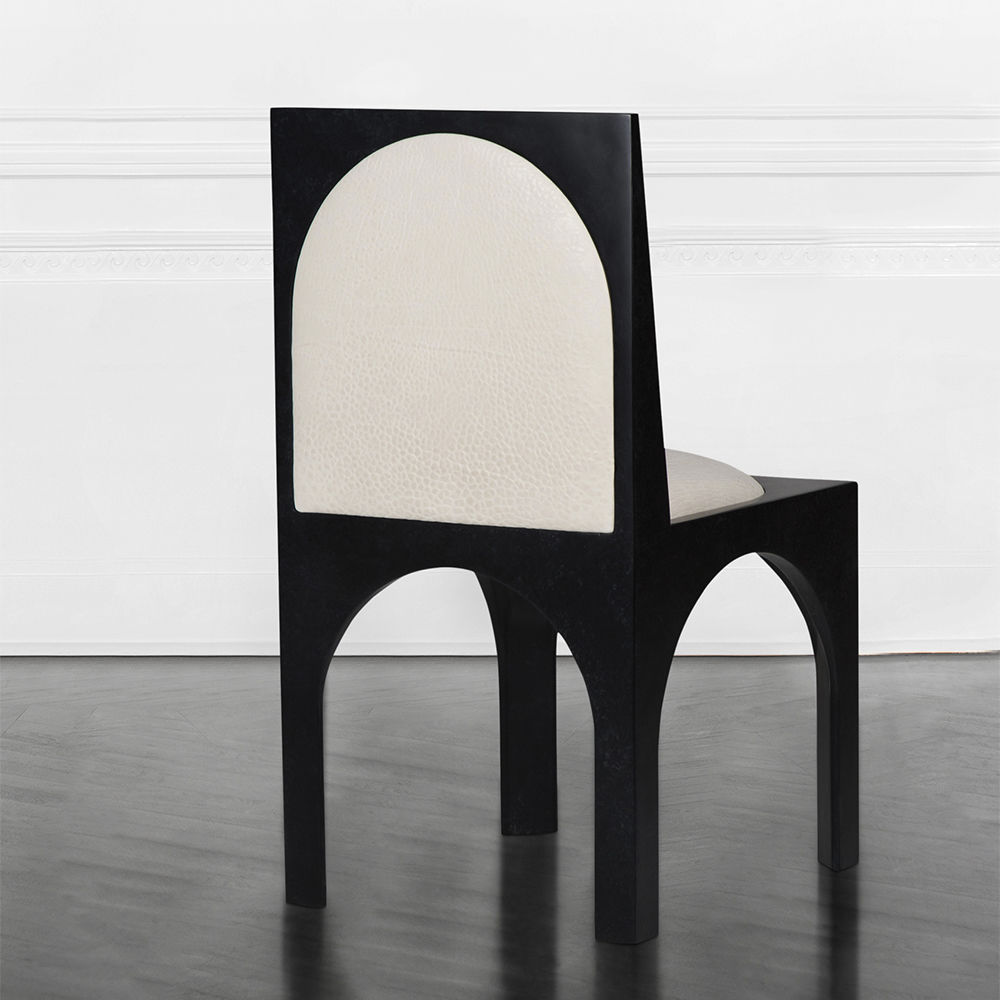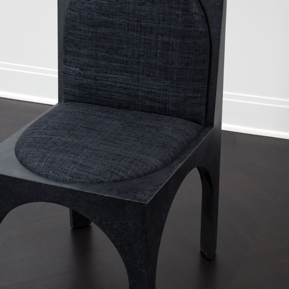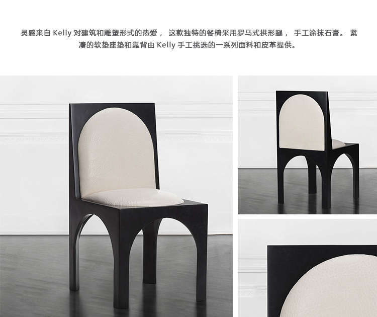 灵感来自Kelly对建筑和雕塑形式的热爱,这款独特的餐椅采用罗马式拱形腿,手工涂抹石膏。 紧凑的软垫座垫和靠背由Kelly手工挑选的一系列面料和皮革提供。