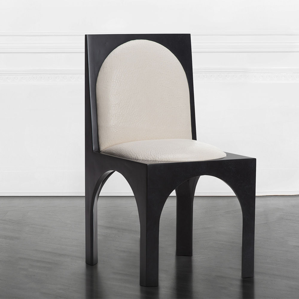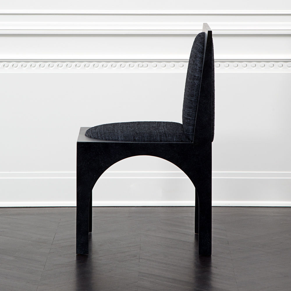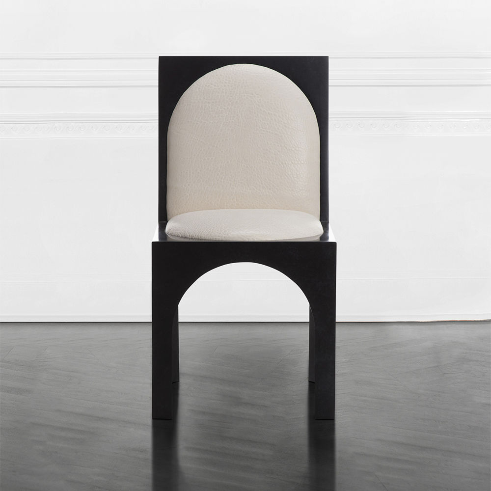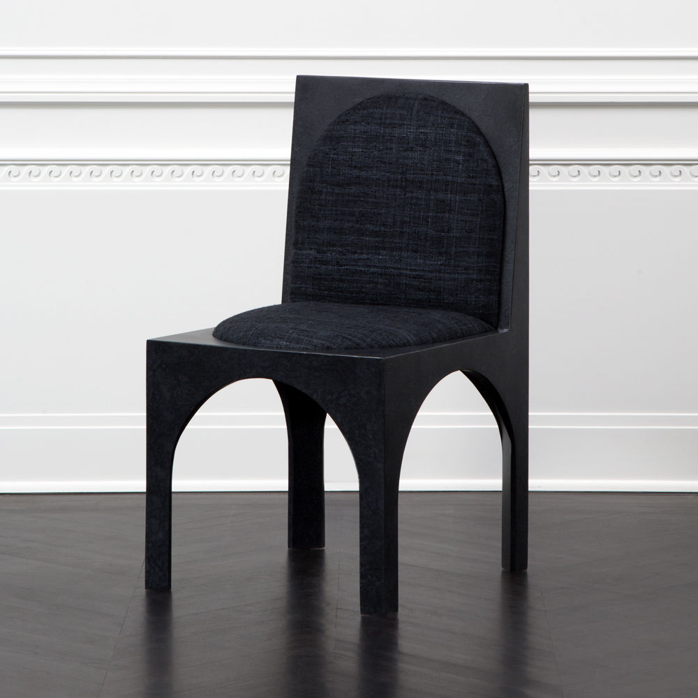 灵感来自Kelly对建筑和雕塑形式的热爱,这款独特的餐椅采用罗马式拱形腿,手工涂抹石膏。 紧凑的软垫座垫和靠背由Kelly手工挑选的一系列面料和皮革提供。