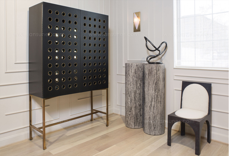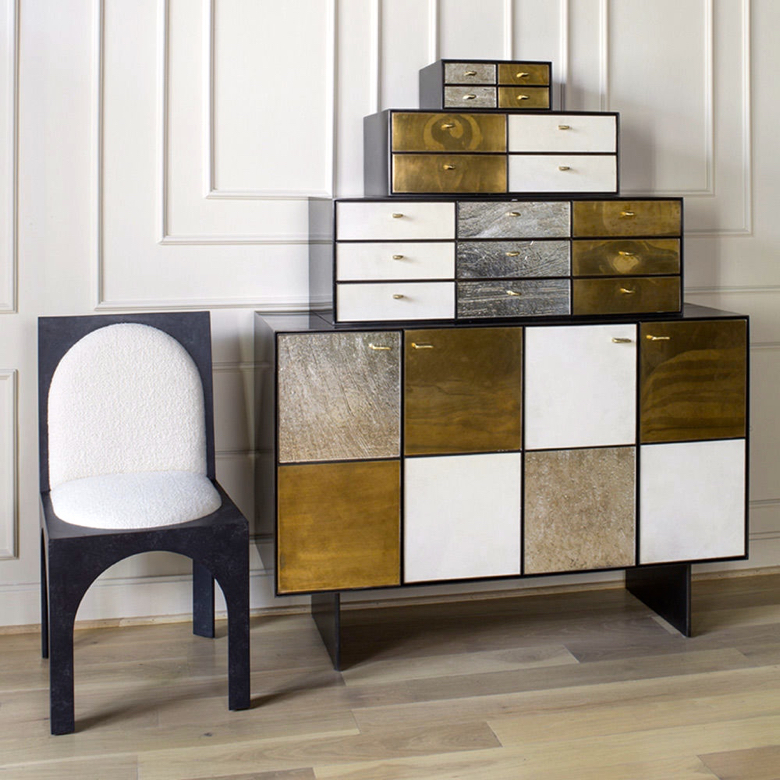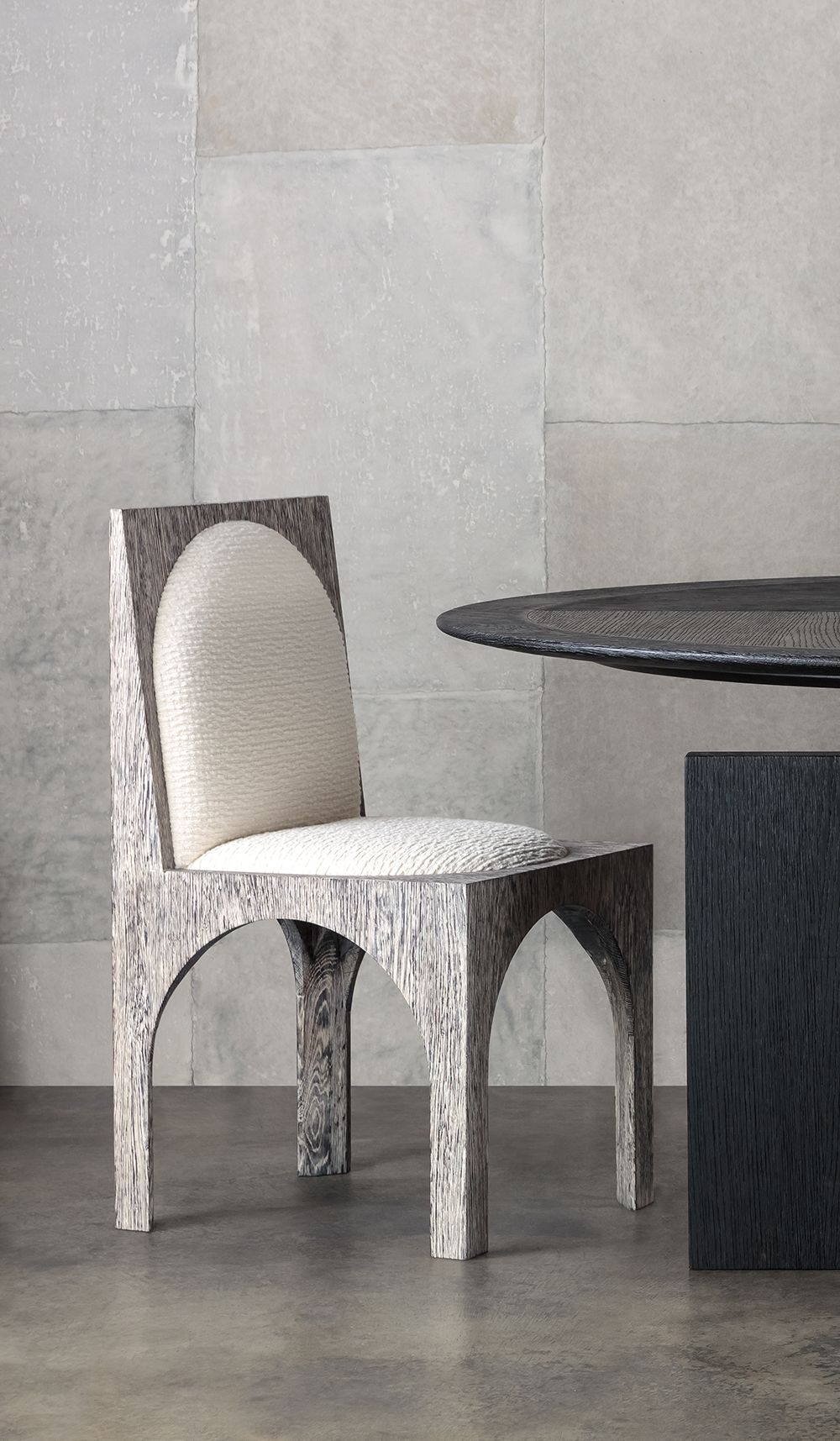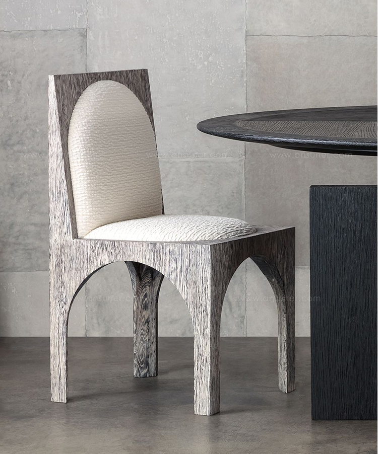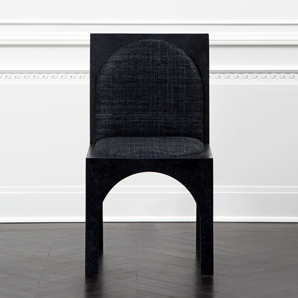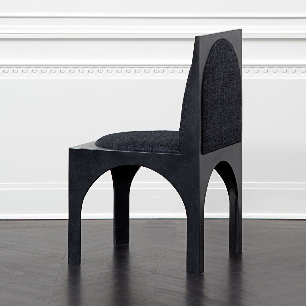 灵感来自Kelly对建筑和雕塑形式的热爱,这款独特的餐椅采用罗马式拱形腿,手工涂抹石膏。 紧凑的软垫座垫和靠背由Kelly手工挑选的一系列面料和皮革提供。