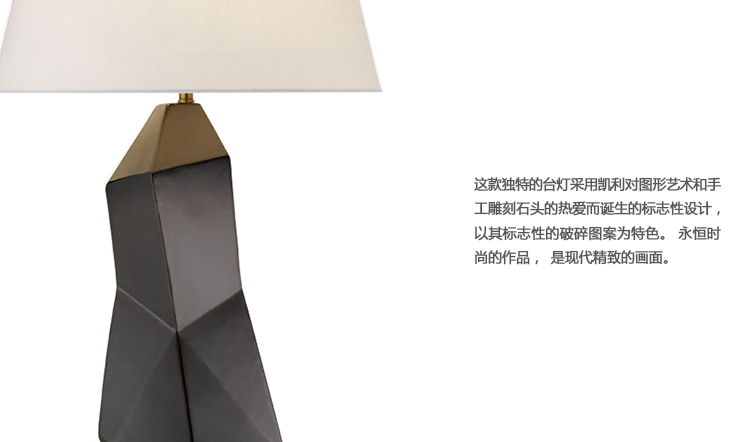 这款独特的台灯采用凯利对图形艺术和手工雕刻石头的热爱而诞生的标志性设计,以其标志性的破碎图案为特色。 永恒时尚的作品,是现代精致的画面。