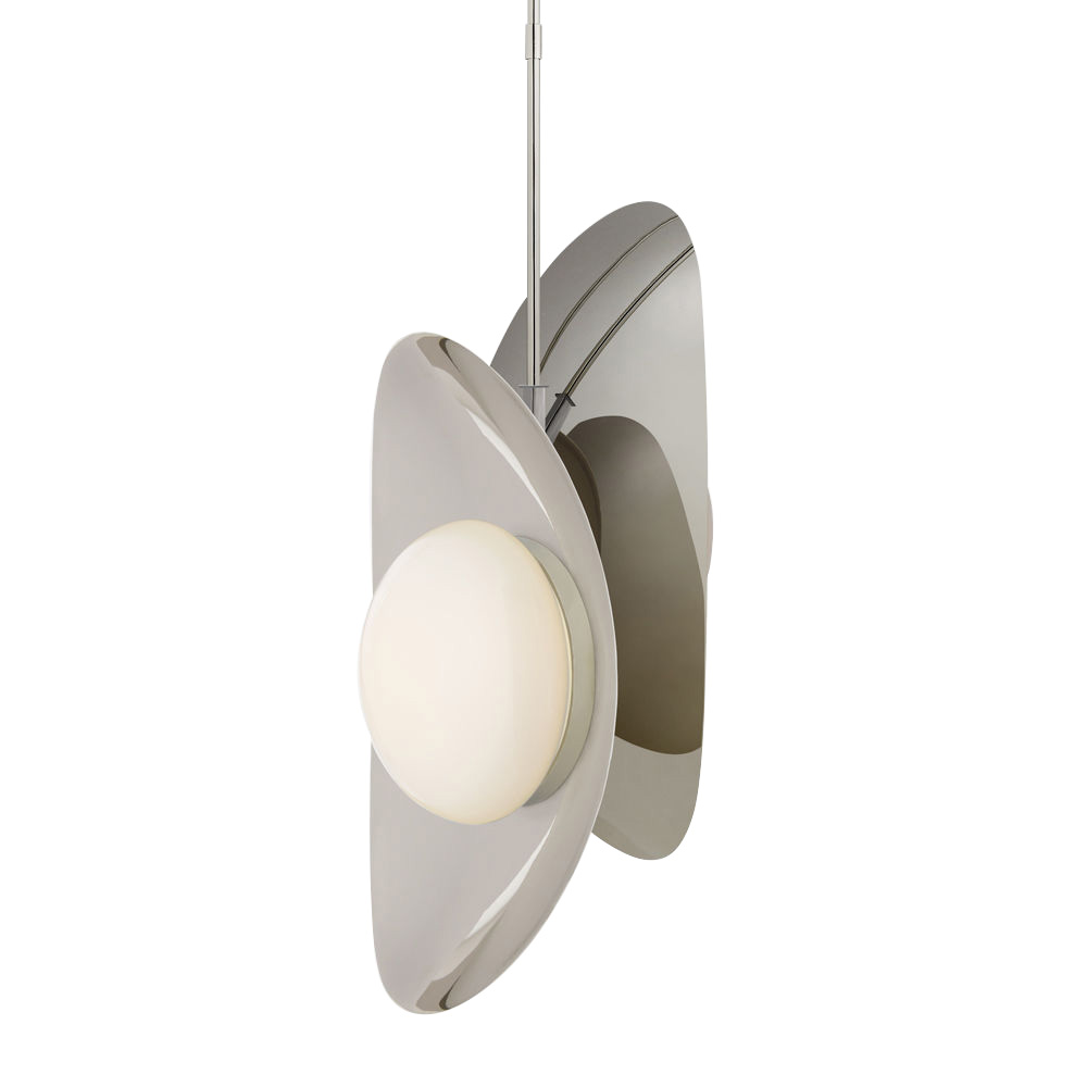 Nouvel小吊灯简约而大胆,突出了混合材料和曲线形式。 这款双吊灯有古董黄铜,抛光镍或青铜和黄铜的组合,每个都有白色玻璃球。 适用于潮湿场所。