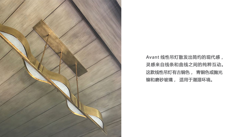 Avant线性吊灯散发出简约的现代感,灵感来自线条和曲线之间的纯粹互动。 这款线性吊灯有古铜色,青铜色或抛光镍和磨砂玻璃,适用于潮湿环境。