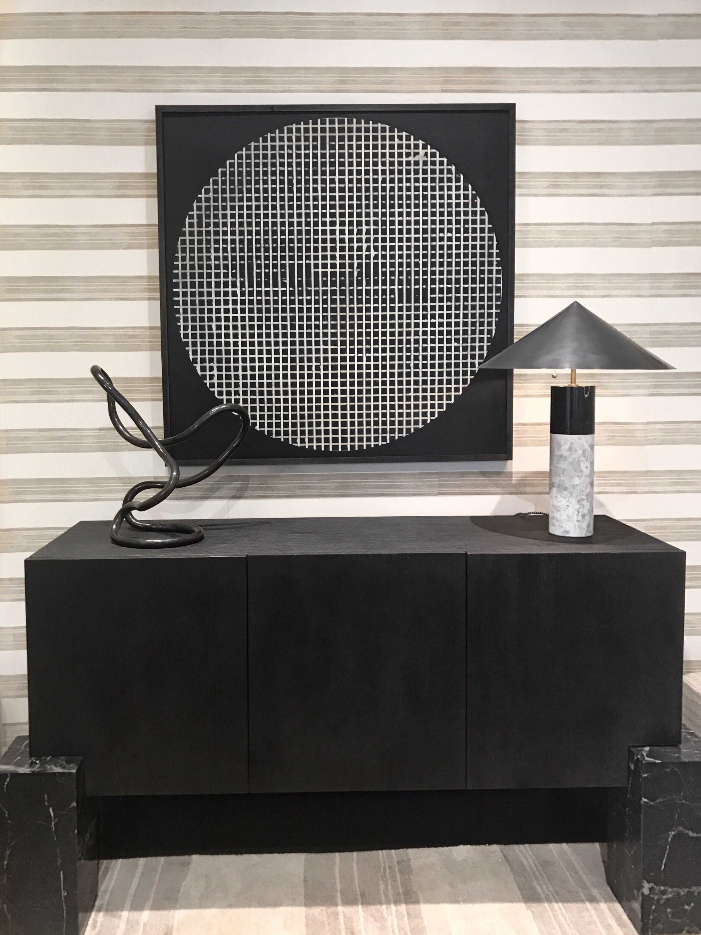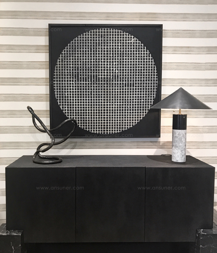 这幅限量版的艺术作品名为“粉笔条纹图”,由美国艺术家马克斯创作。使用多层稀释的墨水形成一个受控的圆形网格,这个作品利用了负空间和精细的手绘线条——一个艺术家构建的框架。