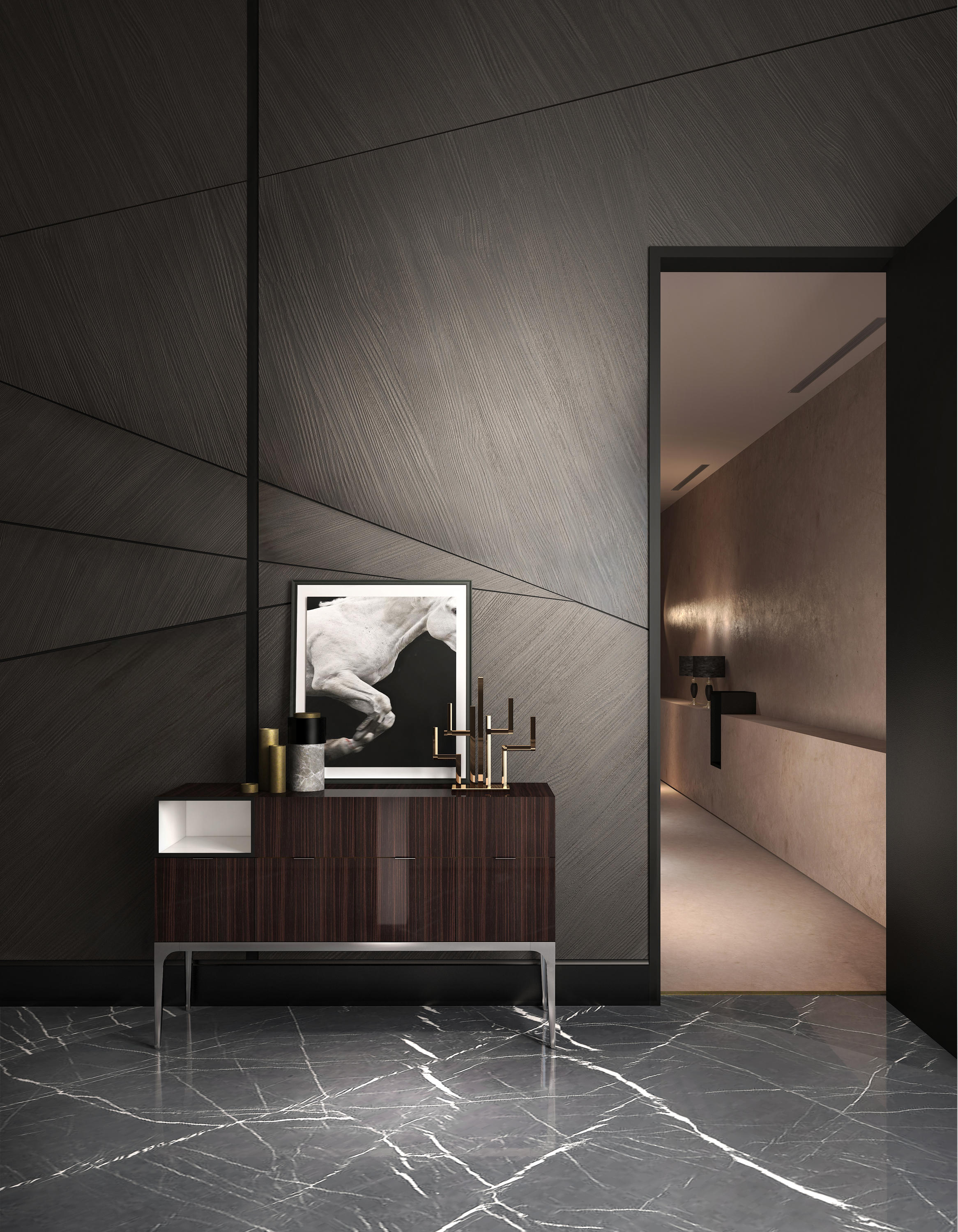 Madia由乌木制成,有七个抽屉和一个开放空间,支撑和镍镀锌金属框架。 利基用皮革覆盖。