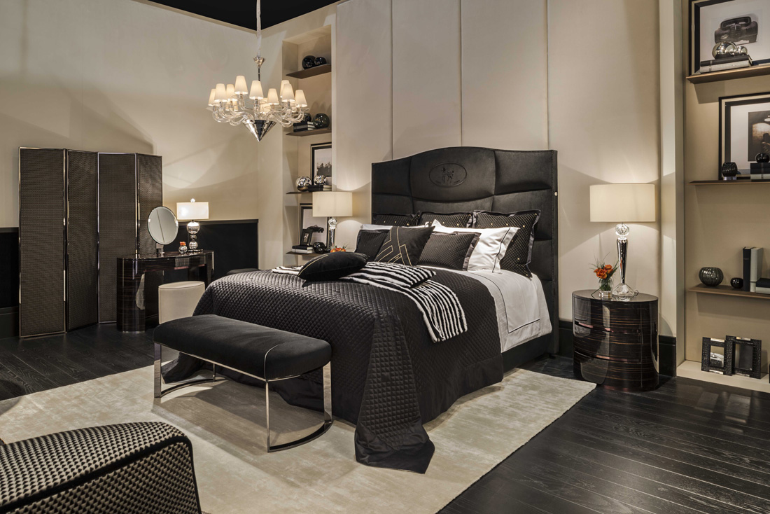 Sumptuous volumes and important dimensions for the new George bed caratherizied by its imposing headboard, finely handcrafted with motif made up of irregular squares arranged in a linear pattern. The soft upholstery is enhanced in the central part by the iconic Villa Borghese embroidery.