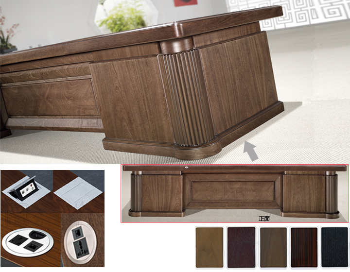 ※ 以上图片是班台细节展示图,突出显示出精湛的雕刻工艺,是一款古典、传统的端庄风格;可配置三插电源孔、网络接口、耳机音频接口、话筒接口、VGA接口,也可根据客户实际需要选择和定做,展现了整洁,整齐的办公环境。 可选择实木颜色,满足更多理想需求。