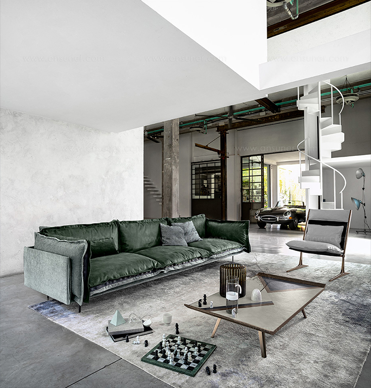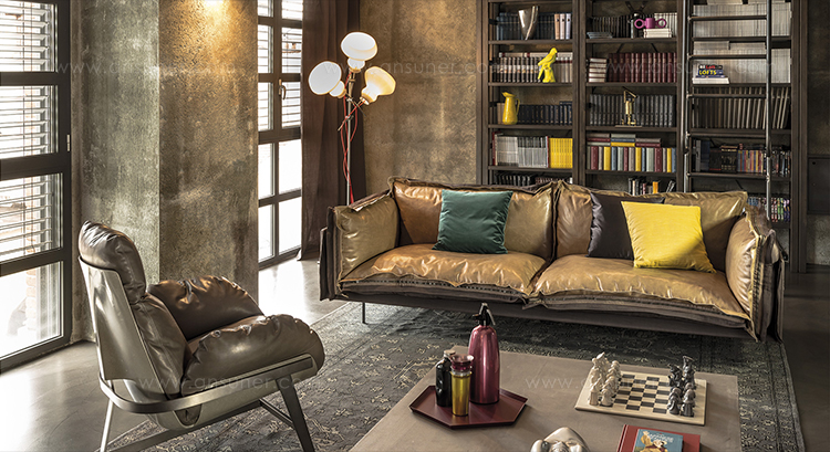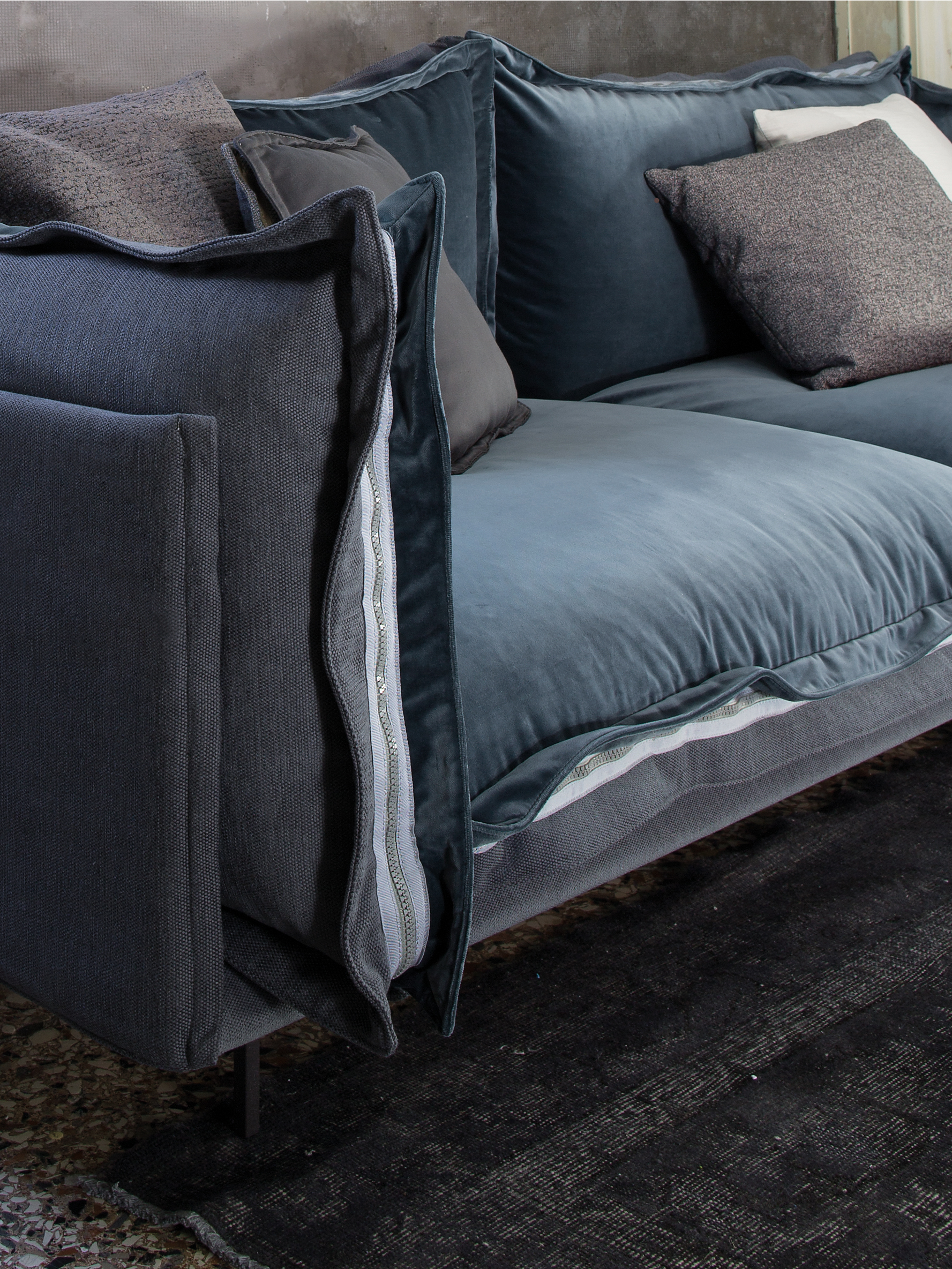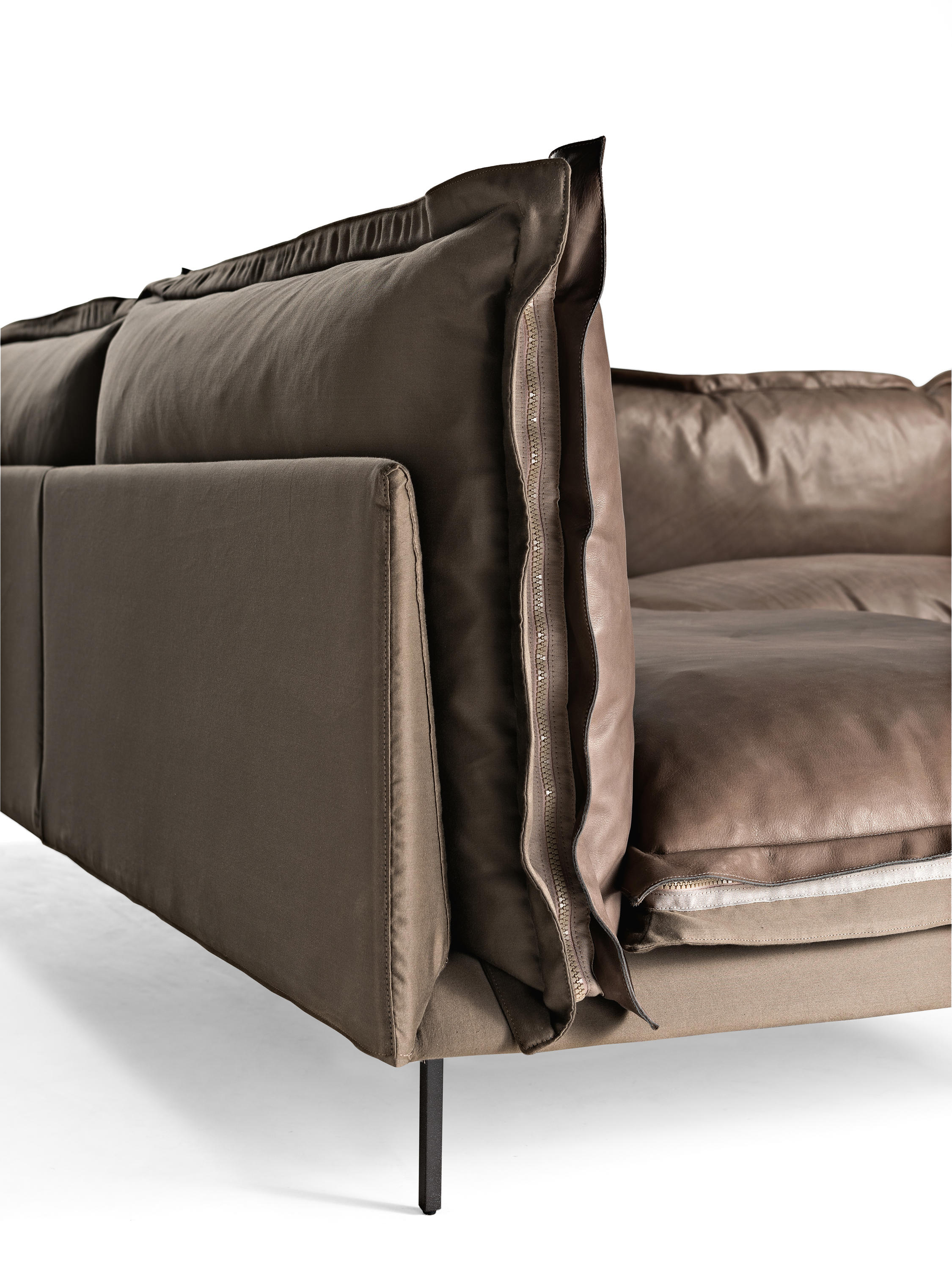 The important zip, applied to the four sides of the cushions, fastens the two-sided cover, one in leather and one in fabric, gives rigour to the sofa and underlines its peculiar design. The result is a sofa in which the softness and warmth of the fabric coexists with the elegance of leather. A peculiar mix of materials to create different chromatic combinations and sophisticated matches. The structure seems to float above the ground thanks to the thin, minimal feet made of square section metal.