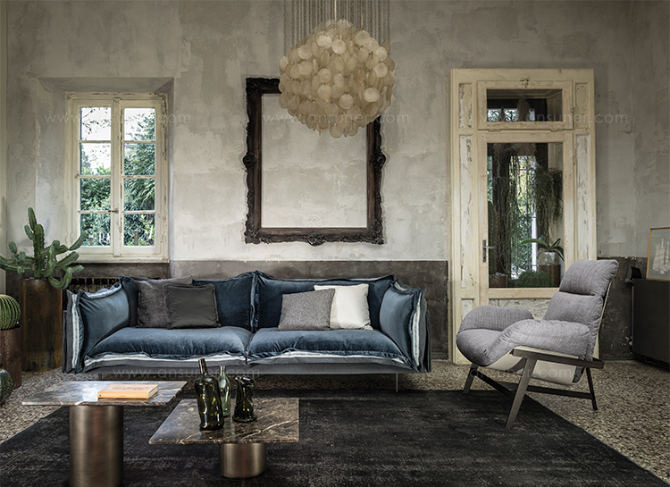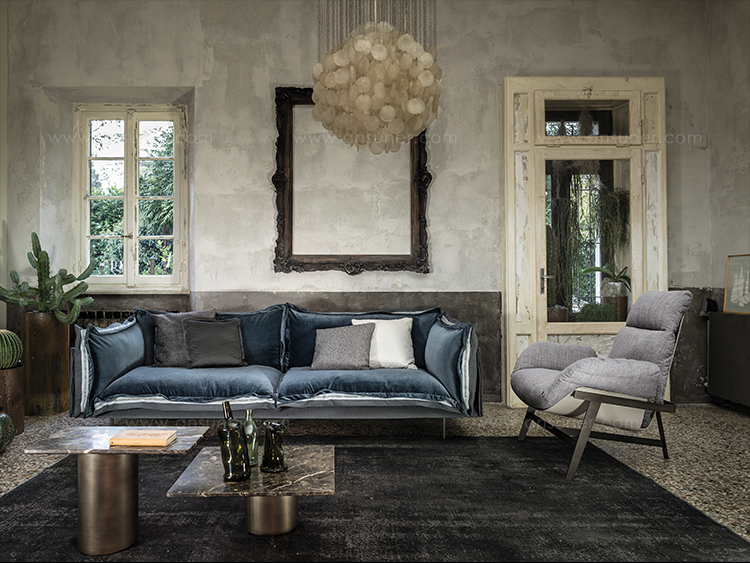 The sofa Auto-reverse by Arketipo, versatile and with a strong personality, derives from the idea of expressing a double soul in the living area. Its apparent casual and untidy look is in contrast with the order and extreme care for the details, to obtain an object with a sharp style and of high quality. The thin structure, elegant and discreet, enwraps and contains the seat cushions, the back and the arms, emphasized by flounces all around the perimeter which grant a definite movement to the line and add a tactile and visual softness to the sofa.