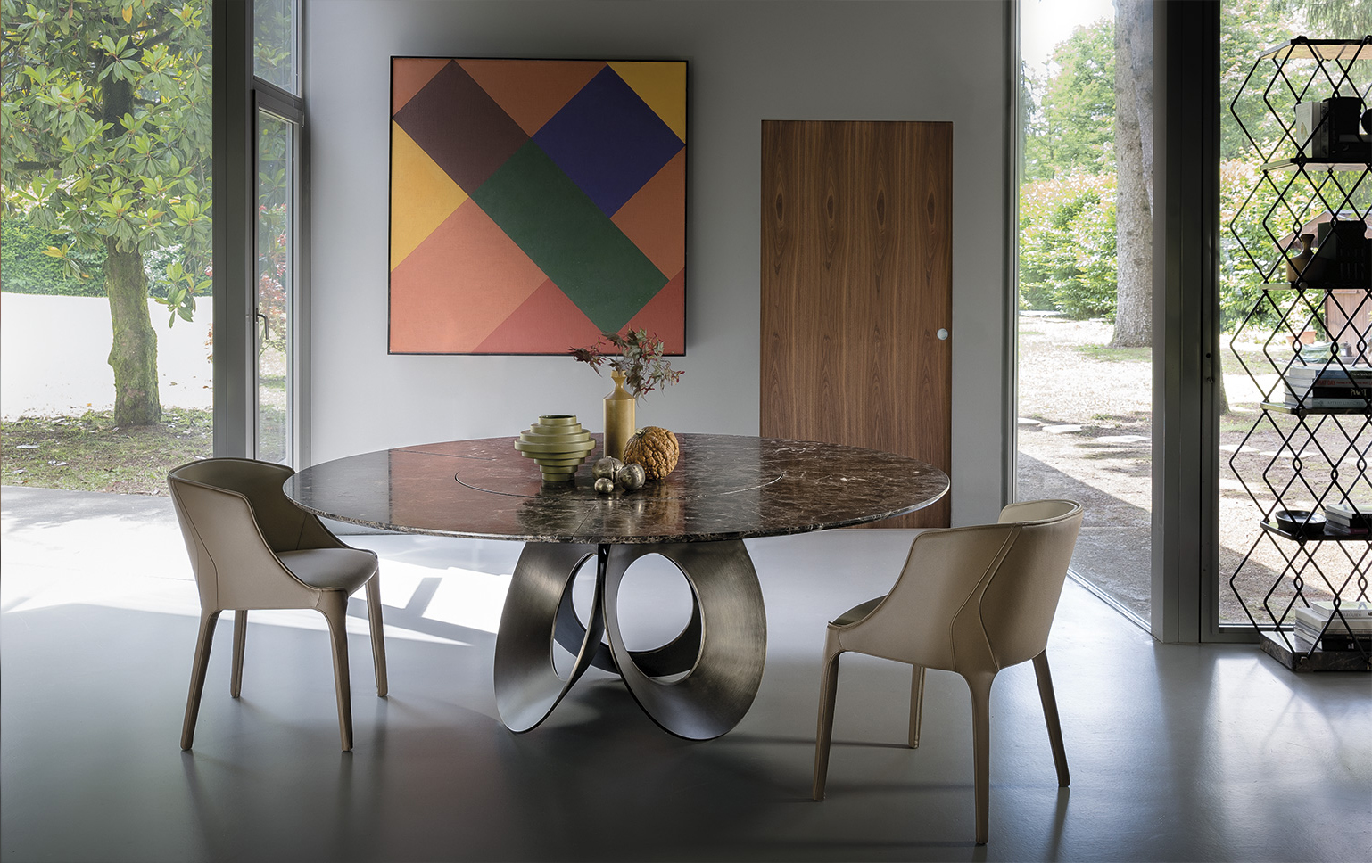 由吉诺·卡罗罗(Gino Carollo)设计的Oracle餐桌是圆形的几何形状,是完美的象征。家具的形状表现出整体性和中心性。圆形或椭圆形的桌面是由MDF镶嵌在莫卡橡木或柚檀木上。直径为200CM的桌面也可以使用啡网纹大理石桌面。它独特的底座就像生命之花的构造:三个重叠的圆圈,似乎围绕着一个点旋转。该金属的底座可用云母棕色、黄铜、钛或新草灰色抛光。
