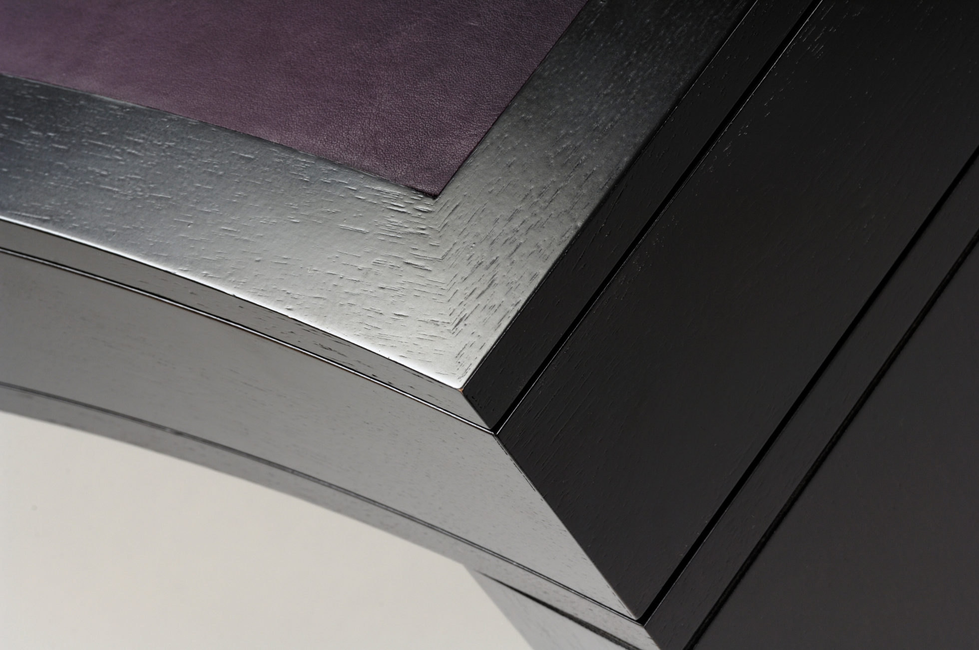 这个雕刻的三抽屉弧形桌子由实木和单板构成。 这件作品采用皮革衬里的燕尾形抽屉,子弹头和实心金属脚。 两个侧抽屉以圆周运动枢转和打开。