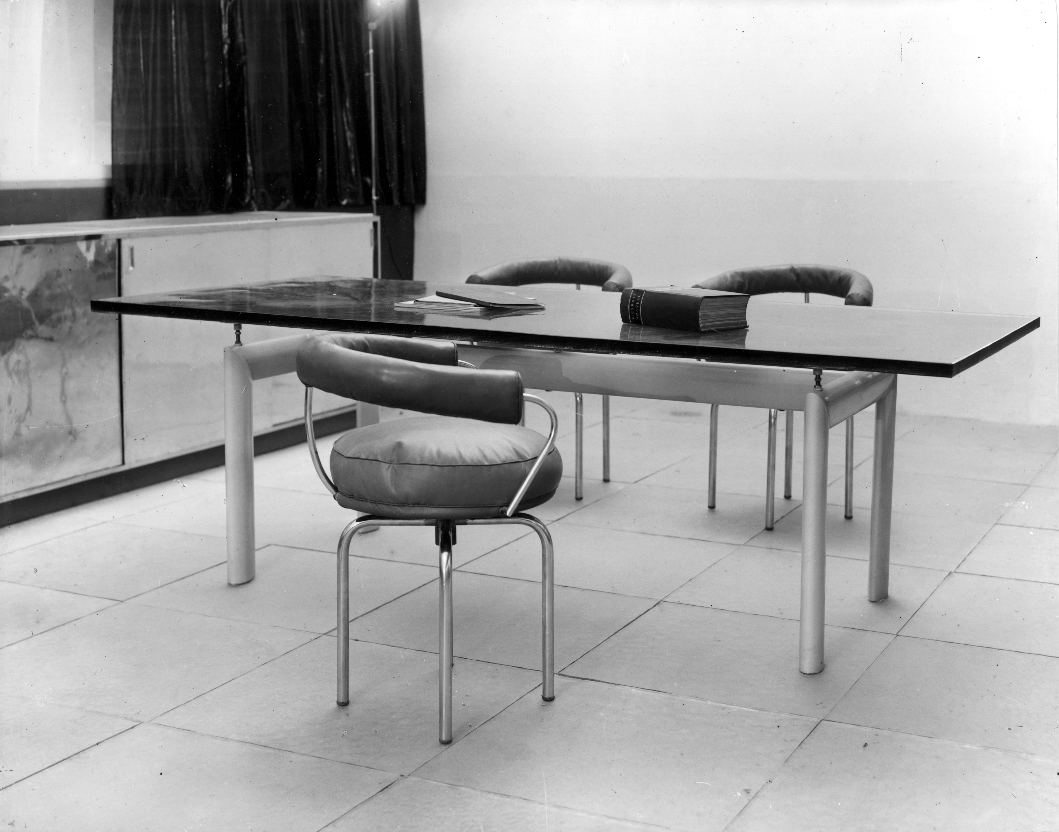 哑光灰色、淡蓝色、绿色、泥土色、象牙白色或黑色珐琅钢结构桌腿。桌腿采用带有钢螺纹杆的四个支撑点,高度调节量可达50mm,晶质网纹玻璃,天然或黑灰桌面。还有两个款式的珐琅钢桌腿和热成型玻璃桌面:哑光钢结桌腿、玫瑰烟灰桌面和哑光象牙白色桌腿、蓝色桌面。该款桌子的桌腿是于1928年使用航空业内用于维持机翼分离的卵形外观来设计的。在1929年巴黎秋季沙龙中展览的款式拥有玫瑰色印花玻璃桌面和绿色桌腿;随后,Charlotte Perriand还开发了蓝色桌面和象牙白色桌腿的桌子模型。