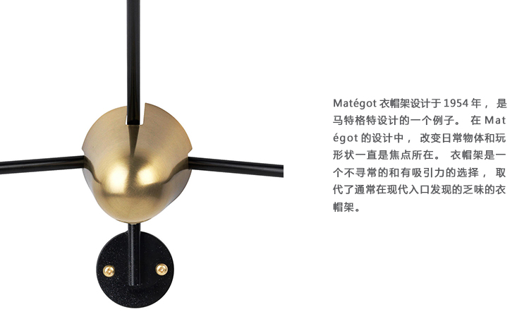 马特格特衣帽架设计于1954年,是马特格特设计的一个例子。在马特格特的设计中,改变日常物体和玩形状一直是焦点所在。衣帽架是一个不寻常的和有吸引力的选择,取代了通常在现代入口发现的乏味的衣架。