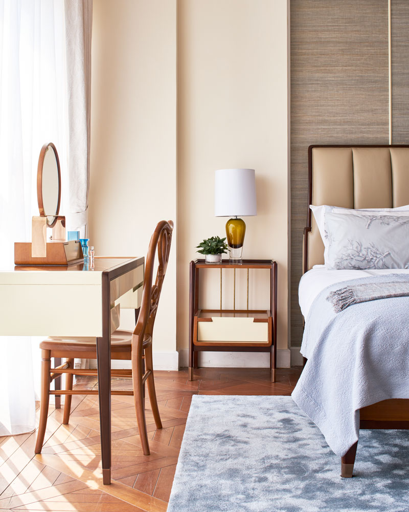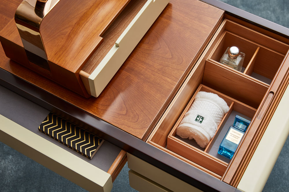 按中国“提篮”的造型设计而来的梳妆镜,精巧中颇具韵味,镜面与桌面可分离,镜面下方的小抽屉面板采用燕尾榫造型,呼应整体调性。抽屉面采用燕尾榫,美观而又实用;铜脚,赋予中式韵味的同时以防磨损;玫瑰金的金属装饰更符合年轻品味。