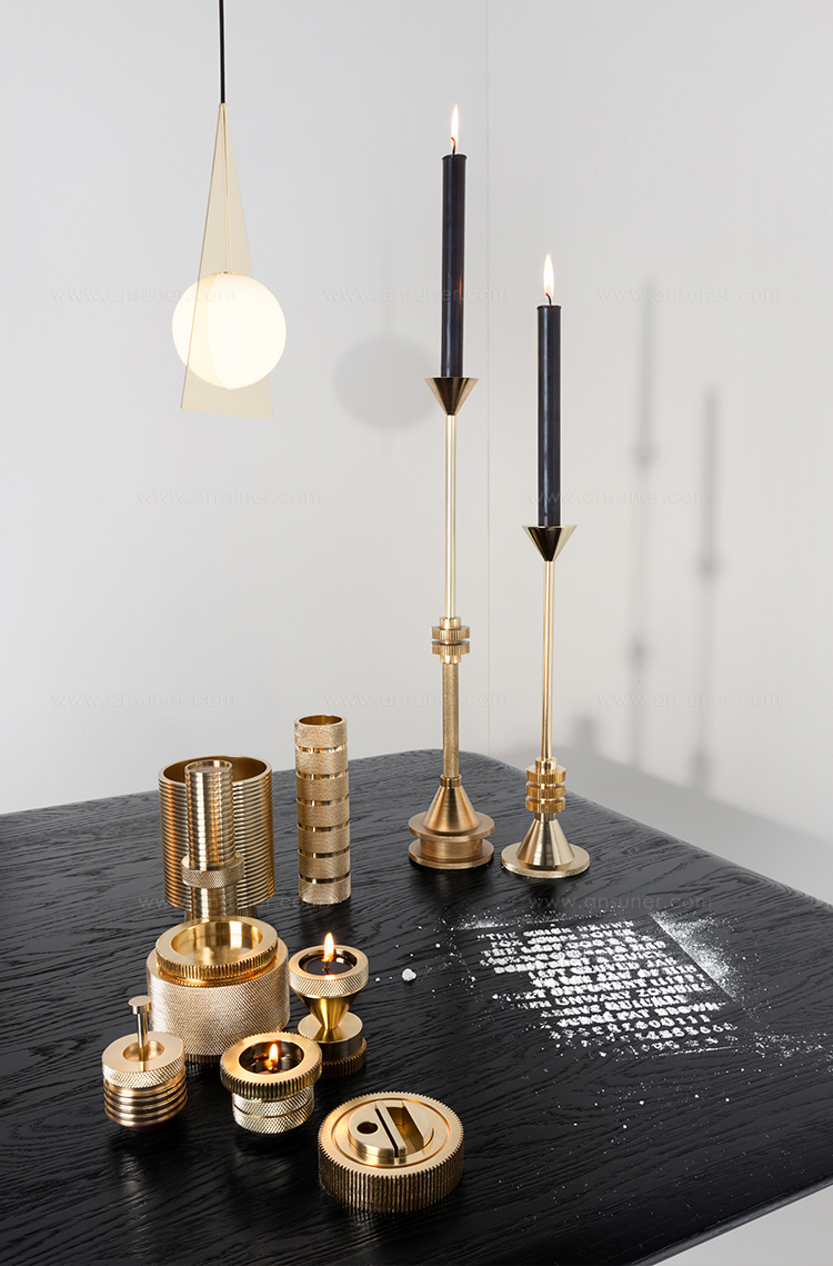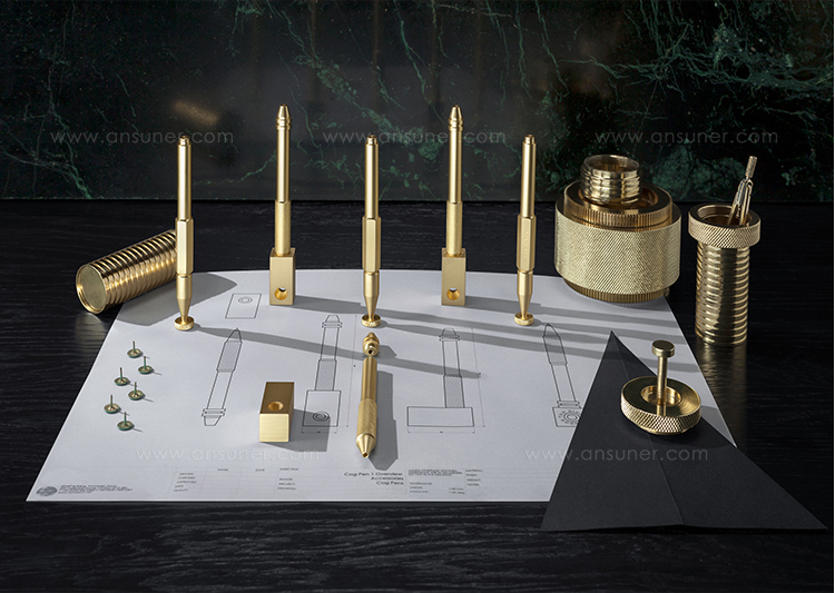 实心铝质生料块和管材在车床上进行加工,使用传统的精密机床进行切削和滚花。然后进行抛光,镀铜和抛光,最后用漆完成。标志深深地刻在底座