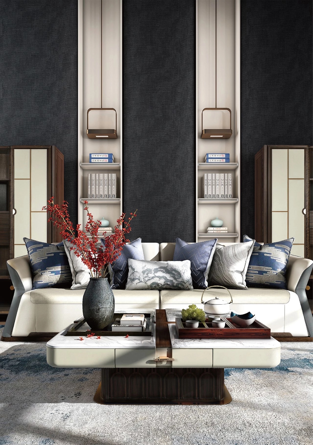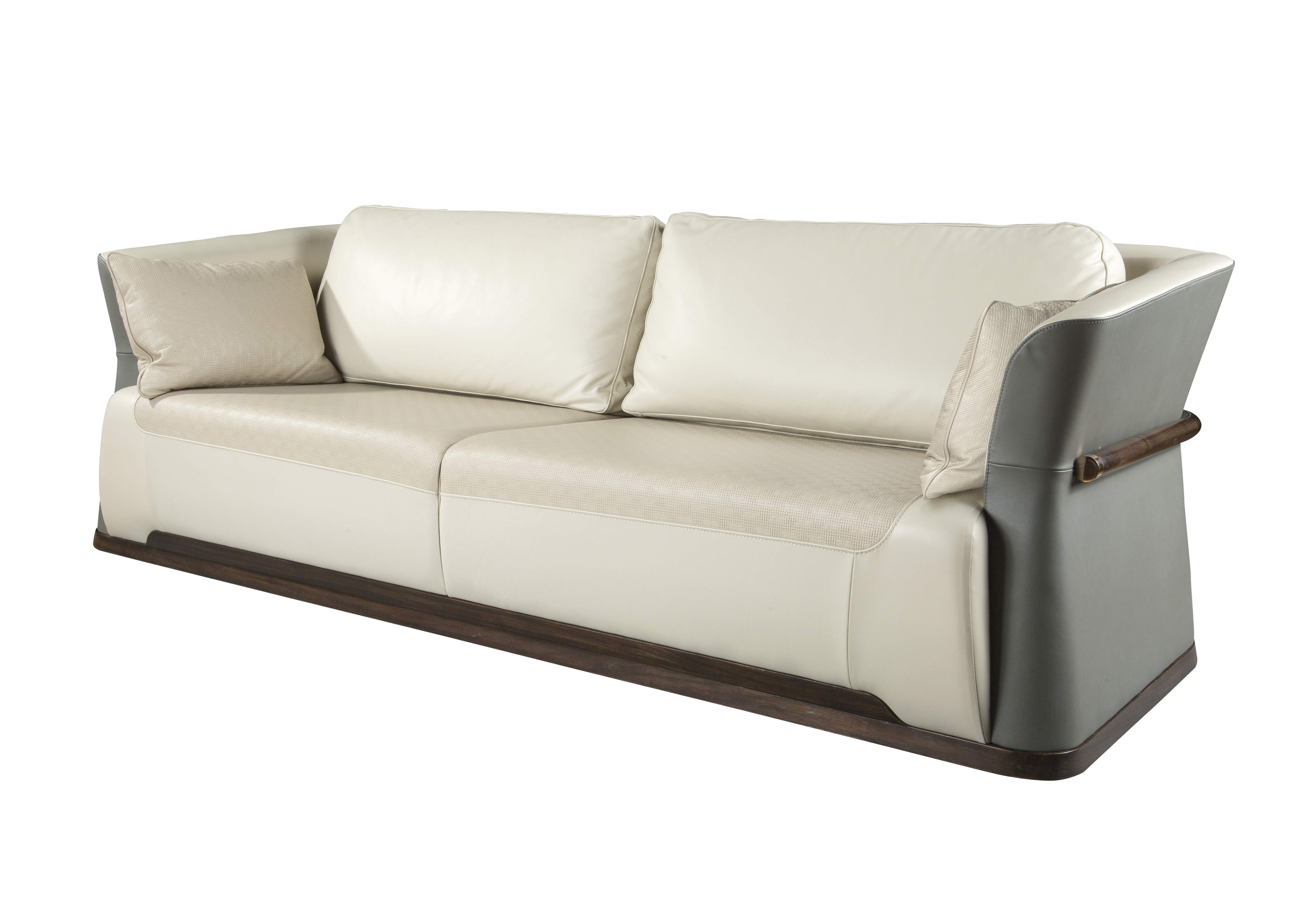 1.沙发整体呈环抱状,寓意家庭成员关爱包容,幸福和睦。 2.靠背造型似女士束腰,柔美优雅。 3.沙发采用大面积支撑设计形式,稳重大方。 4.沙发采用皮布结合设计,皮质易于打理,质感十足; 布艺触感温柔,透气舒适。