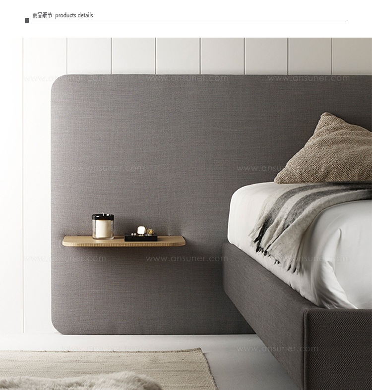 不同宽度和高度的圆形嵌板,不同颜色的织物组合,浮动的书架和有抽屉的床头柜:用Lota系列为你的卧室增添你的个人风格。