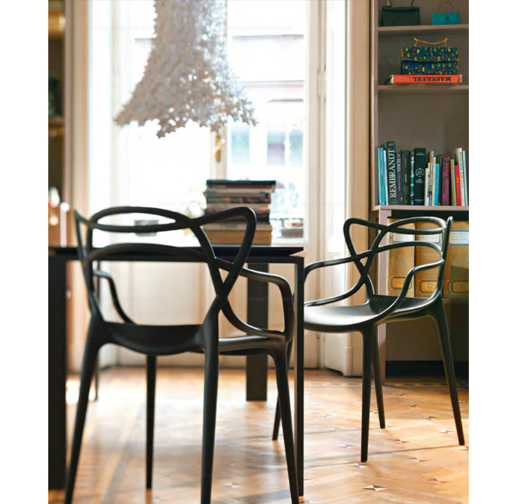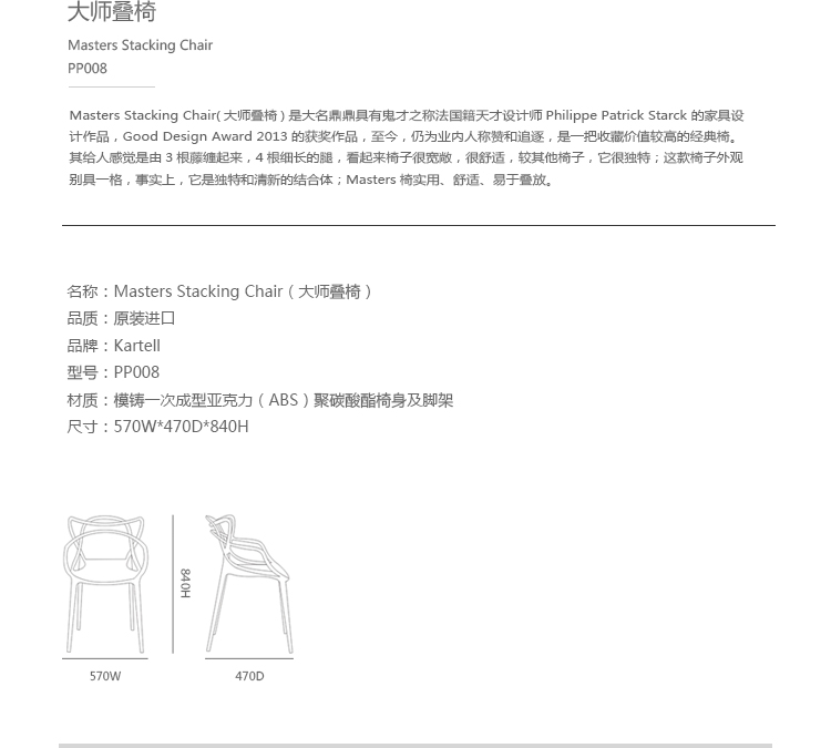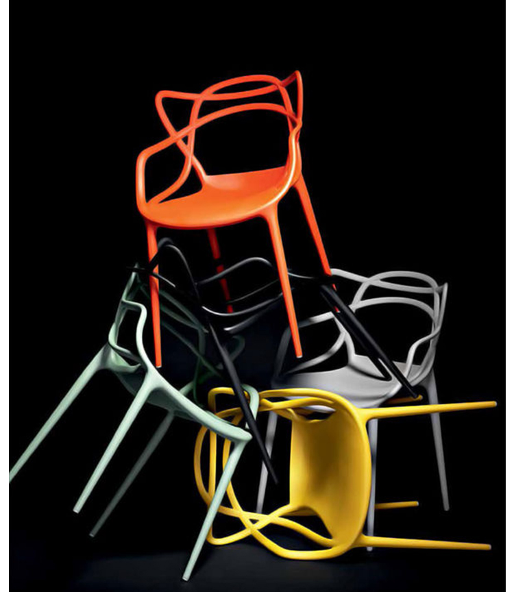 Masters Stacking Chair(大师叠椅)是大名鼎鼎具有鬼才之称法国籍天才设计师Philippe Patrick Starck的家具设计作品,Good Design Award 2010 和 Gold Dot Award 2013的获奖作品,至今,仍为业内人称赞和追逐,是一把收藏价值较高的经典椅。其给人感觉是由3根藤缠起来,4根细长的腿,看起来椅子很宽敞,很舒适,较其他椅子,它很独特;当然,它还非常坚固,你不需要担心它是否能承受一个人的重量。这款椅子外观别具一格,事实上,它是独特和清新的结合体;Masters椅由纤细椅腿作支撑,座位空间很大,并且舒适感极强。这款椅子最吸引人的是其特殊的椅背,三个不同靠背向下延伸,在椅座处融合,形成柔美的交叉线条,从而打造出丰满而空灵的空间感。Masters椅实用、舒适、易于叠放。