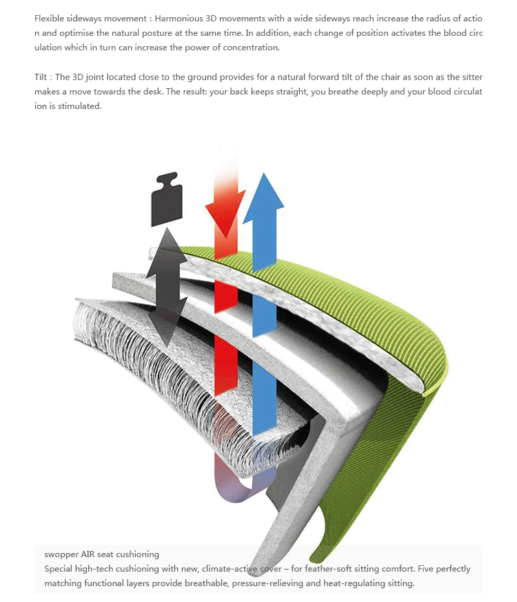 Swopper Stool(跳跳凳)是设计师Henner Jahns别具心裁的设计。椅子物料选用高质量,易于清洁的座椅罩面料:超细纤维面料赋予座椅更多色彩。螺旋弹簧是由精钢制造,使swopper移动时能提升,供稳固而有弹性,独一无二的坐感,您可以根据你的体重分别设置弹簧硬度,脚座采用压铸铝,可选配固定脚或轮子。Swopper Stool(跳跳凳)能让你体验到 “坐”着运动 德国swopper座椅自1997年推出市场以来,以其创新的3d技术,全胜实现使用者向各个方向的运动,彻底颠覆了办公椅市场。其独特的三维运动能让你在办公的同时乐在其中。此座椅在国际设计舞台上屡获殊荣。Swopper Stool(跳跳凳)是以让你坐不踏实为目的而设计的健康办公椅,坐在上面你就需要靠脊椎和背肌保持平衡,如此可达到锻炼脊椎软骨和背肌的作用,并保持大脑的兴奋度。