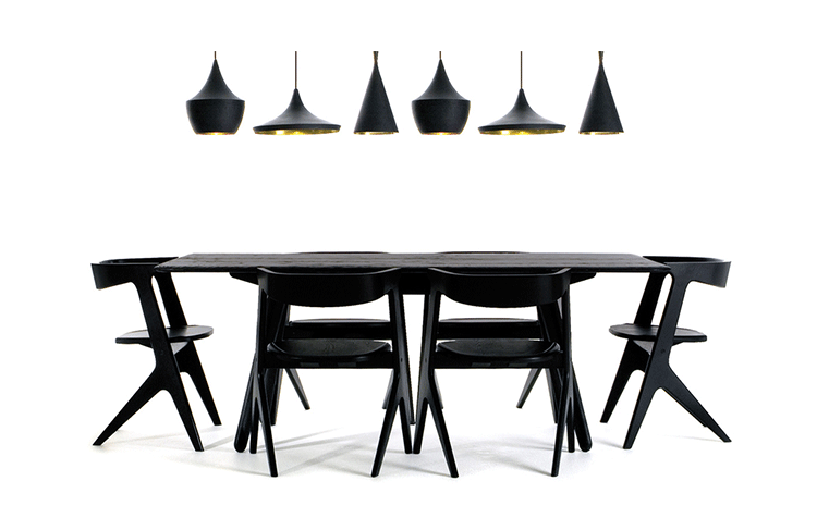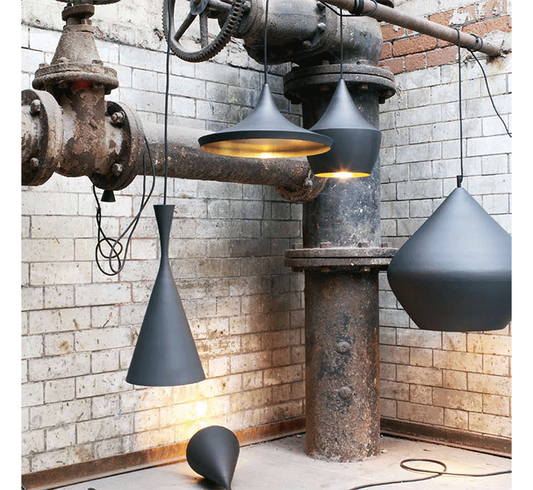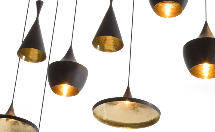 "Designer Tom Dixon was inspired by the shapes of Indian water carrying vessels when he designed his group of four different pendant lights. Hang just one, grab a pair, or hang the entire group of four in a composition of your own creation. The hand beaten brass ages naturally, creating a patina black external surface in contrast to the warm golden interior. available in 4 different shapes and sizes. "