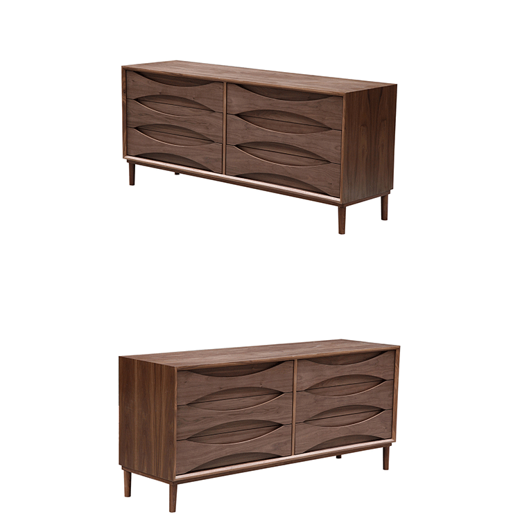 arne vodder retro lowboy dresser(arne vodder复古短脚衣橱梳妆台)是Kardiel公司制作的经典实木家具,具有世纪中期的现代风格,6个滑动式抽屉通过精心制作,提供足够的空间存放衣物或其他物品。在现代主义的存储家具上, Finn Juhl和 Arne Vodder 最先尝试胶木和天然木的组合运用。这是大胆的创新,他们结合传统的新鲜的新兴技术与现代主义的概念。制作采用精选MDF板基材胡桃木或水曲柳木皮贴面、胡桃实木或水曲柳实木脚架、环保油漆喷涂、做工精湛。