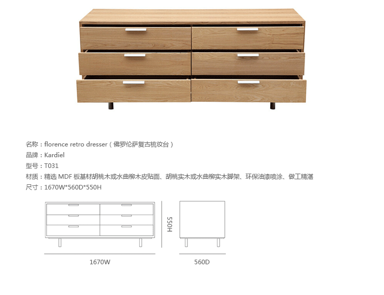 florence retro dresser(佛罗伦萨复古梳妆台)是Kardiel公司制作的经典实木家具,具有世纪中期的现代风格,复古的形式满足现代的审美,简洁干净的线条,功能齐全,有6个滑动式抽屉,提供充足的存储空间。制作精良,灰木单板材质经过仔细完成和抛光到丰富的自然光泽。制作采用精选MDF板基材胡桃木或水曲柳木皮贴面、胡桃实木或水曲柳实木脚架、环保油漆喷涂、做工精湛。