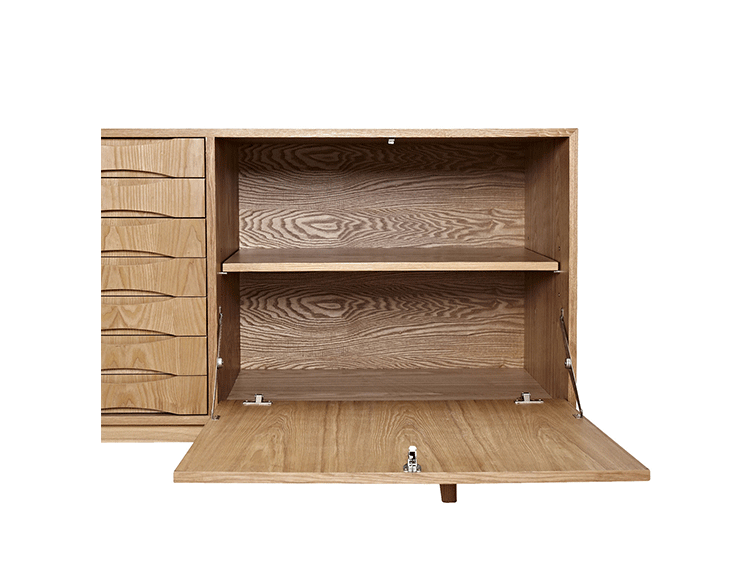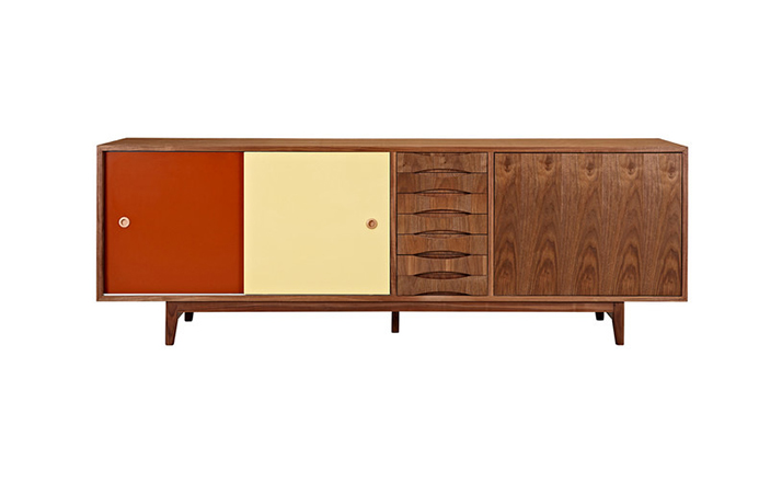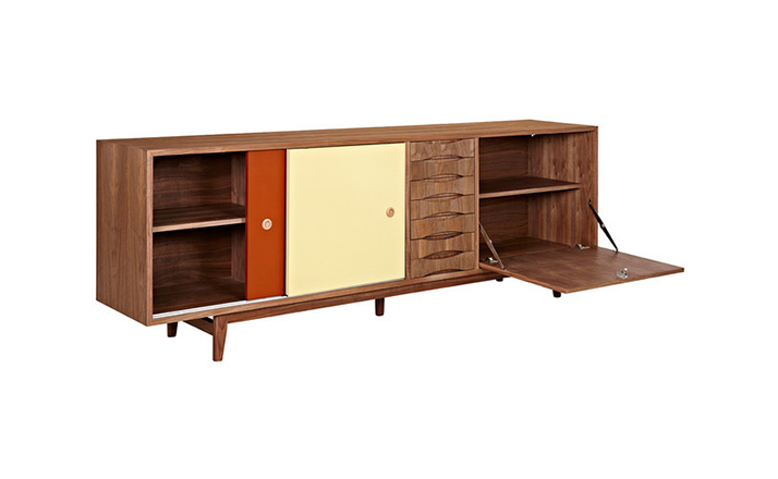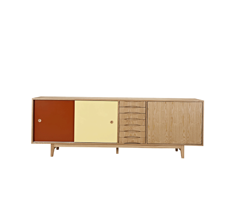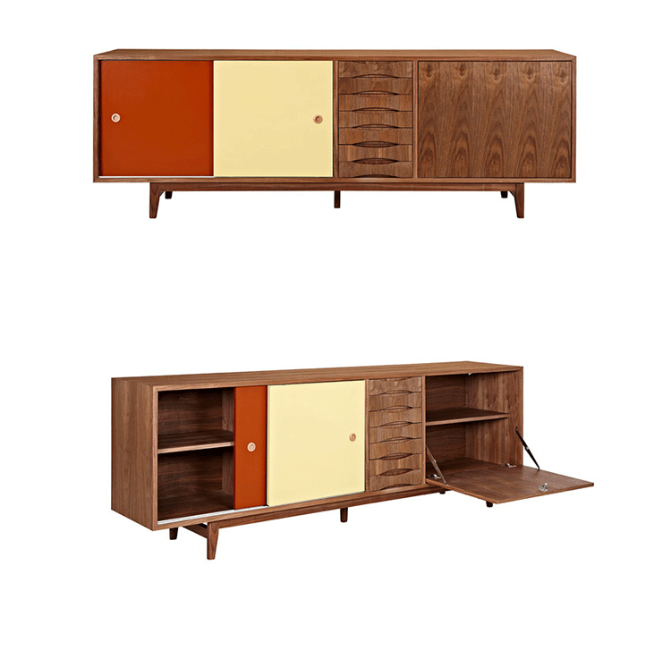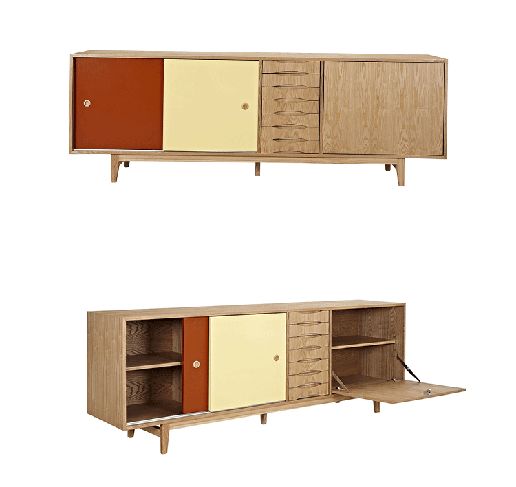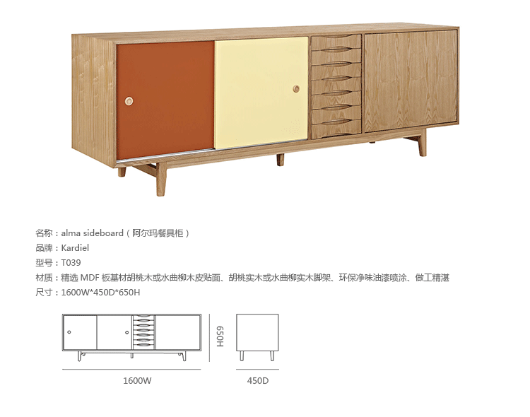 alma sideboard(阿尔玛餐具柜)是Kardiel公司制作的经典实木家具。阿尔玛餐具柜是少数几件在任何环境下都非常令人印象深刻的家具。拥有它,你会知道没什么是餐具是太大了以至于没地方安放。超大储物间和开放存储将容纳任何东西无论从站饰物到服装或餐具。另外一扇门的颜色组合使其适合在任何多彩的房间里,创建一个和谐的环境。Finn Juhl和 Arne Vodder 最先尝试胶木和天然木的组合运用。这是大胆的创新,他们结合传统的新鲜的新兴技术与现代主义的概念。他们通过这些色彩绚烂的产品所实现的是令人印象深刻的比例的平衡。制作采用精选MDF板基材胡桃木或水曲柳木皮贴面、胡桃实木或水曲柳实木脚架、环保净味油漆喷涂,做工精湛。