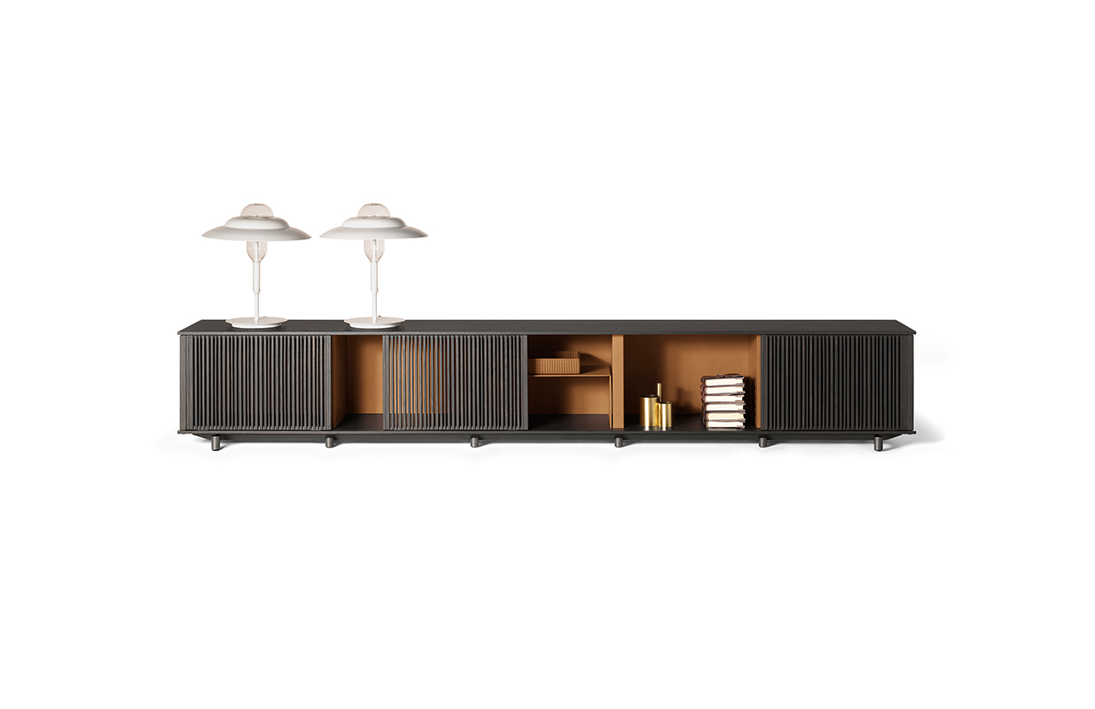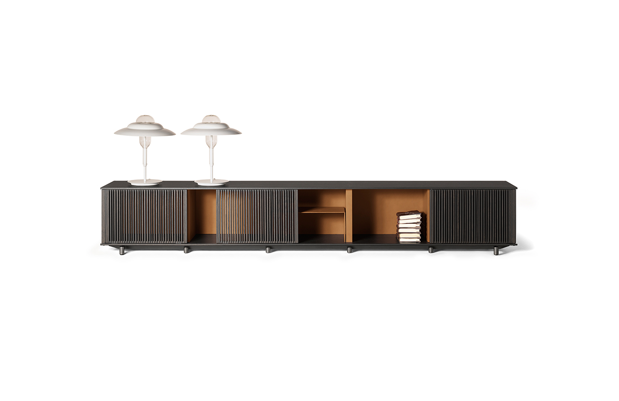 一系列的薄垂直木制棒光网格形式,无形的水平轨道上运行从上到下。 每个网格可以根据需要创建不同的序列。 固体和空洞的分数波动,光与影。 一个好玩的游戏,允许的内容、书籍和对象,没有完全揭示。 最先进的技术结合传统材料,木材和马鞍皮革,形成一个固体和简约的结构。