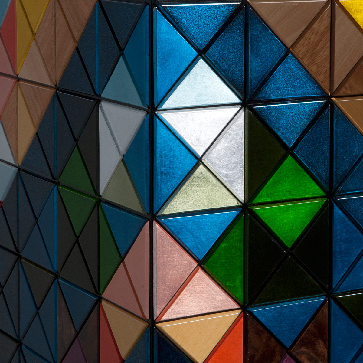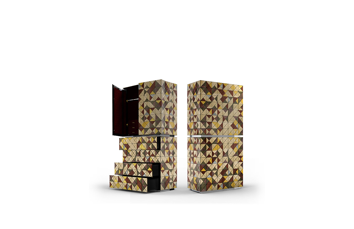 1088木森林的多样性和完成三角形:银叶,金箔,彩色涂料,十个不同类型的木材叶(乌木单板、非洲胡桃木单板、zebrano单板,杨树单板,黑黄檀。 室内:两扇门在里面完成钻石绗缝蓝色丝绸织物开放九个抽屉用金旋钮和内阁空间所有年龄在镜子里完成。 基础:抛光黄铜