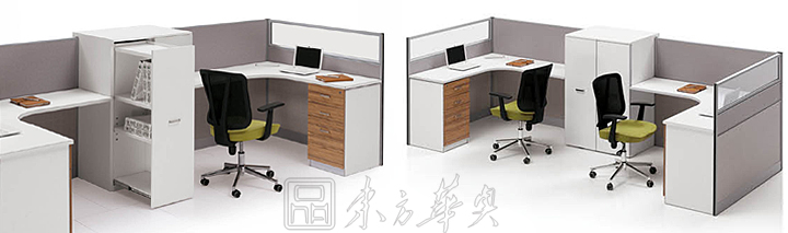 ※ 工作站中加装较高的桌上屏风,来创造工作团队中也有属于自己的区域。用高屏风来区隔本工作团队和别人。