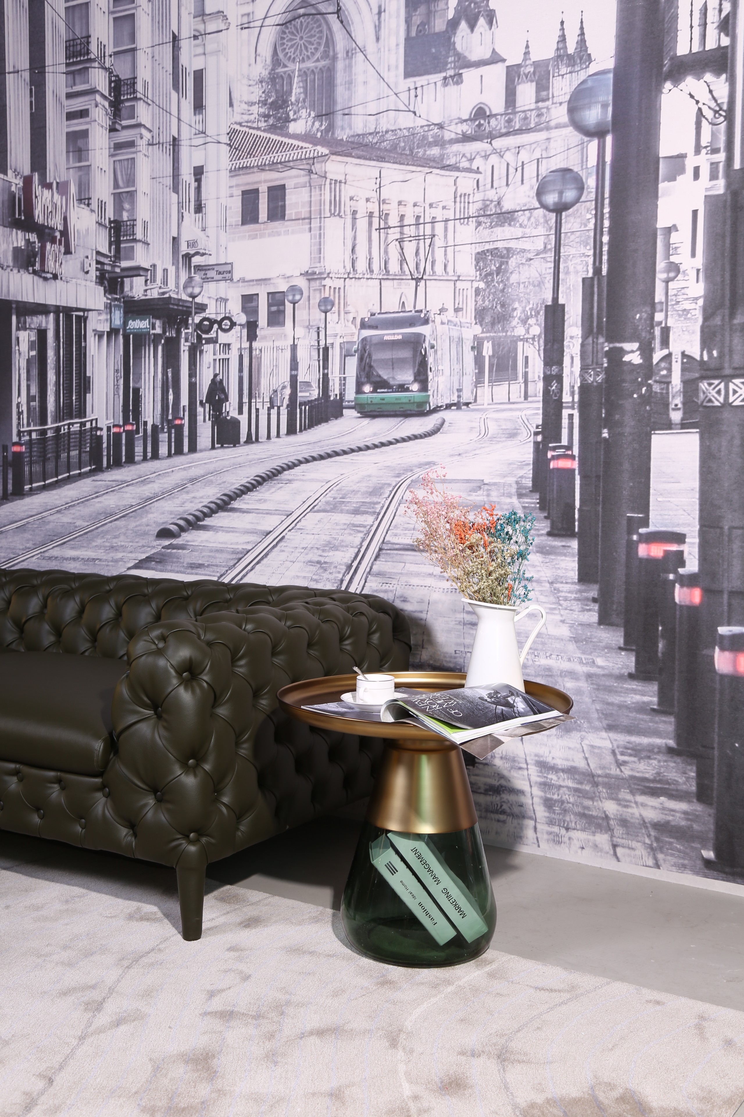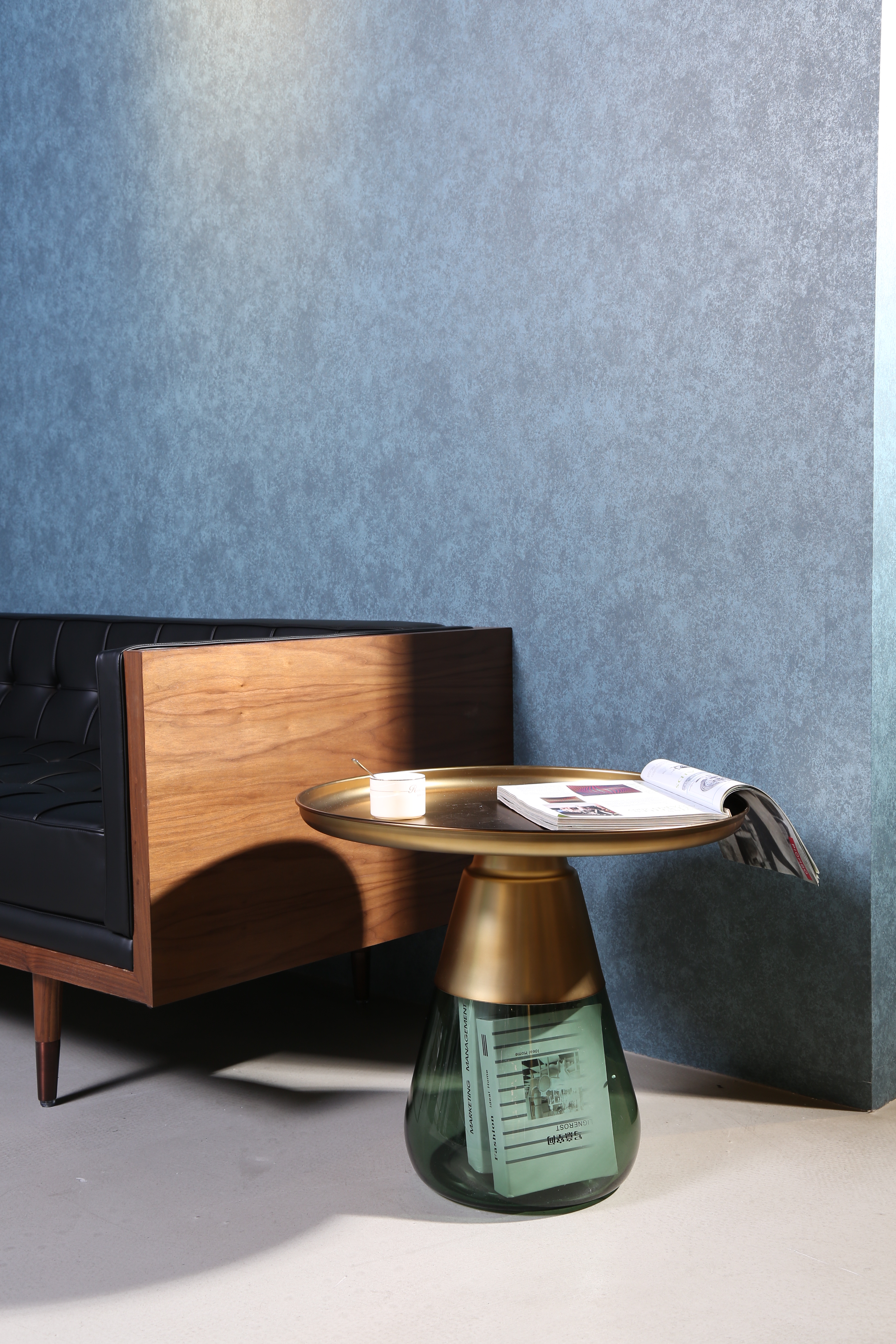 这款半透明带有色彩的玻璃和铝合金组成的手捧咖啡几,有着穿越历史长河的影子,竟像是宫廷画中拿出来的一般,底座的玻璃带给人温润如玉的视觉和触觉的通感。