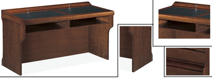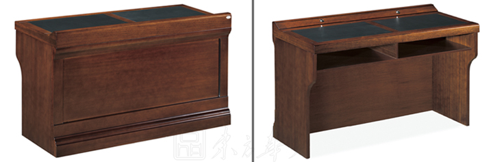※ 全木制结构条形桌,桌脚可做直形及弧形,下设空格储物空间,内嵌式皮垫写字板,麦克孔,满足不同需要;