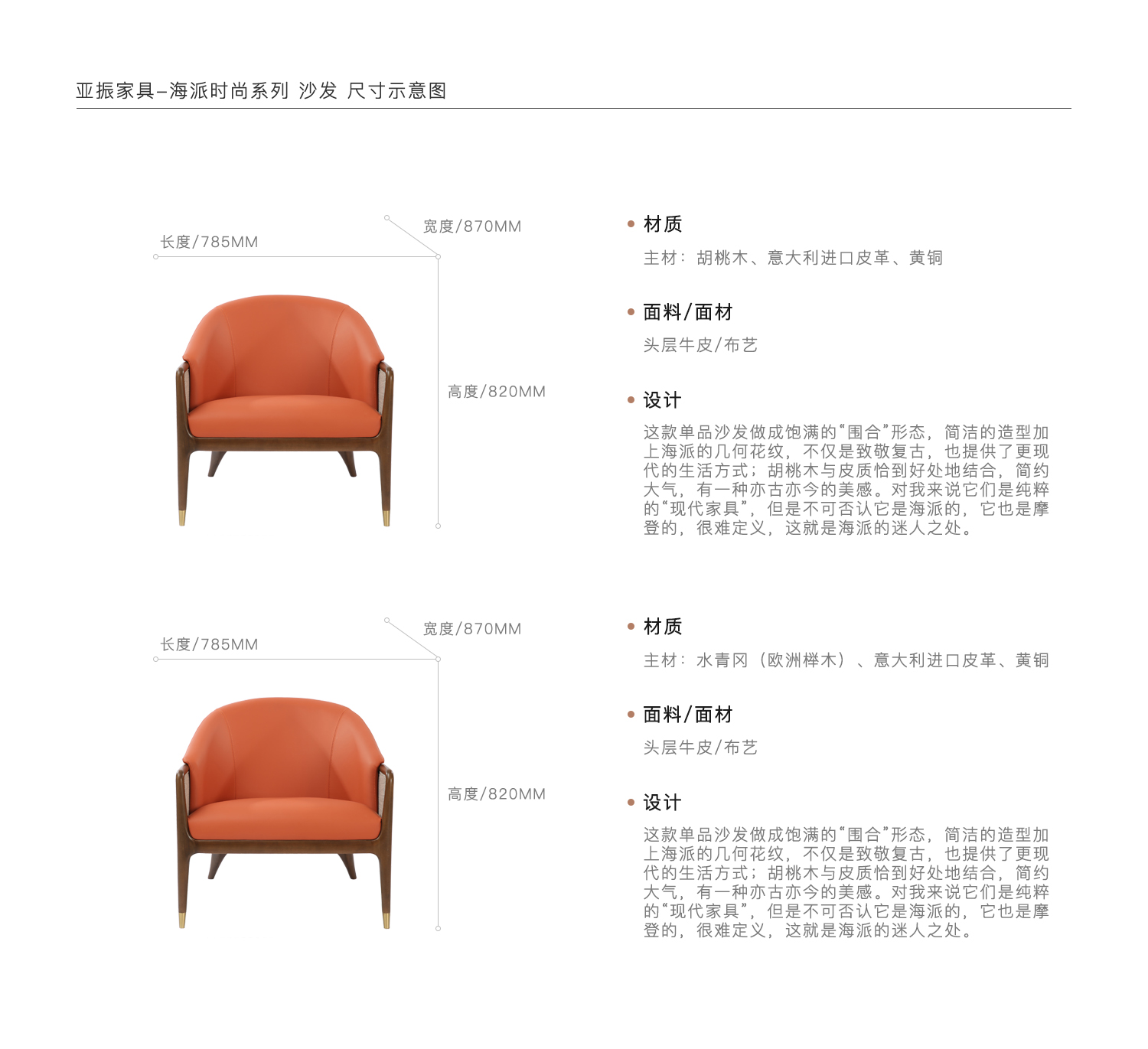 这款单品沙发做成饱满的“围合”形态,简洁的造型加上海派的几何花纹,不仅是致敬复古,也提供了更现代的生活方式;胡桃木与皮质恰到好处地结合,简约大气,有一种亦古亦今的美感。对我来说它们是纯粹的“现代家具”,但是不可否认它是海派的,它也是摩登的,很难定义,这就是海派的迷人之处。