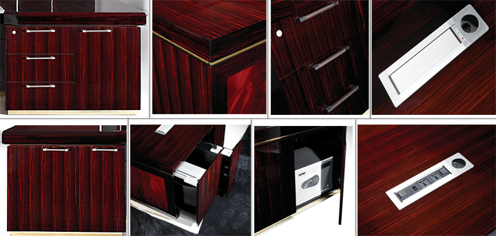 ※ 系列配套文件柜,顶级黑檀木,304拉丝不锈钢皮革拉手,阻尼门铰,薄至5MM的铝边框,黑色烤玻璃,并配以金色脚线,让奢华成为经典!