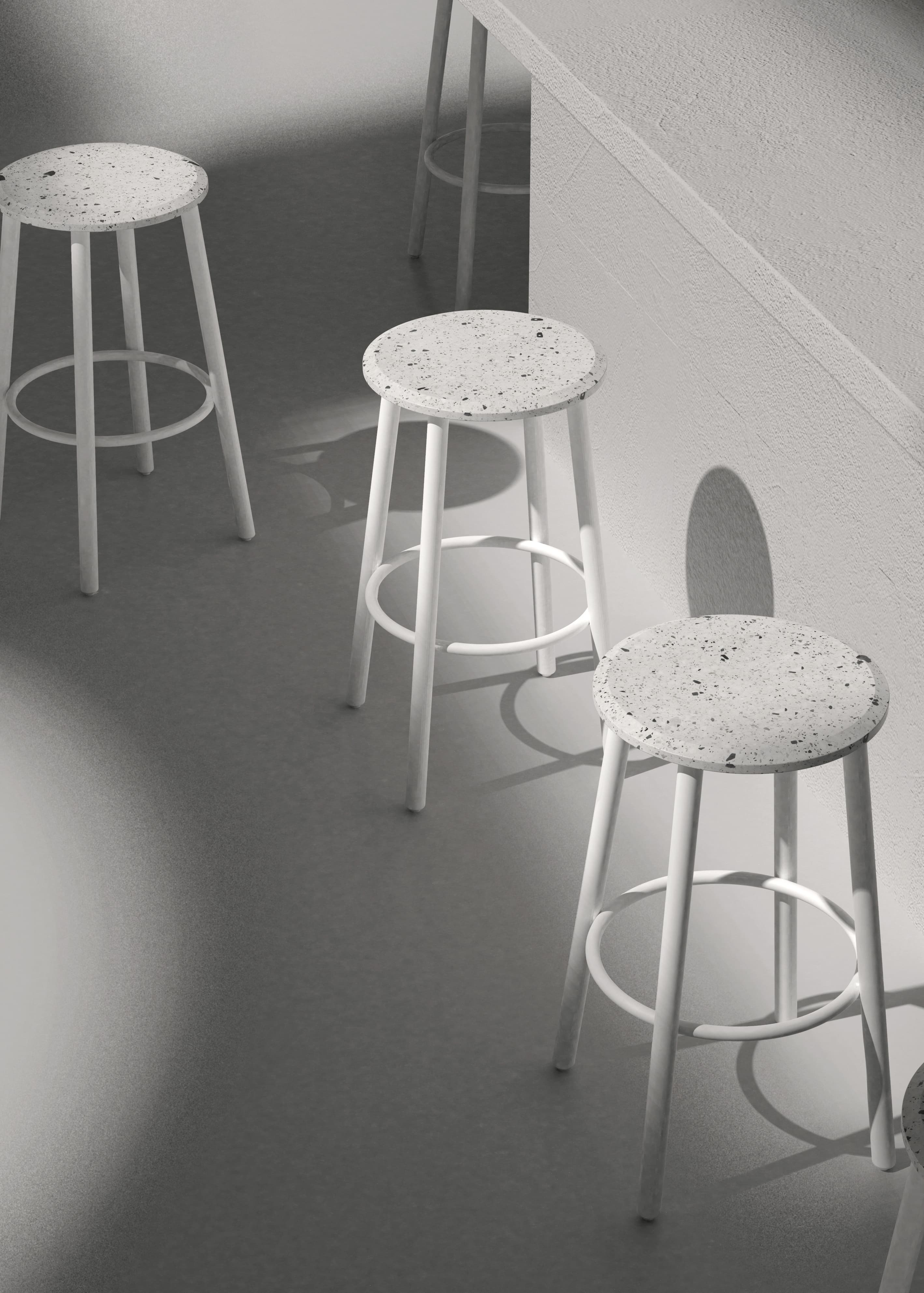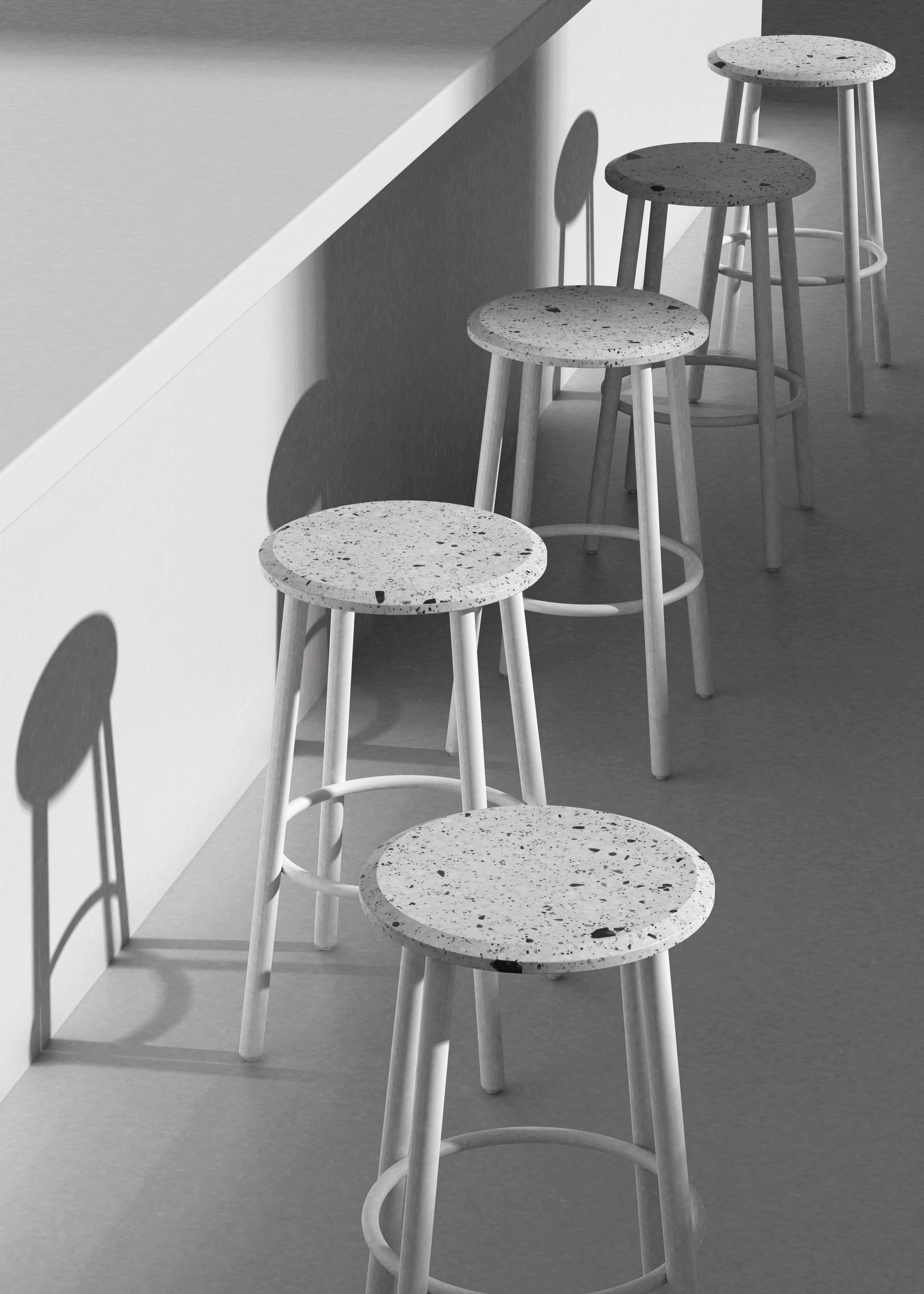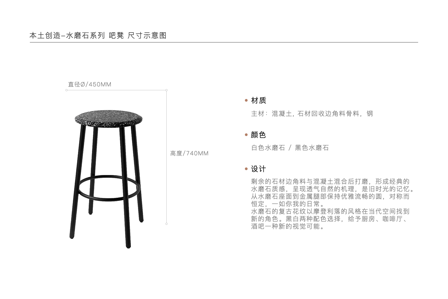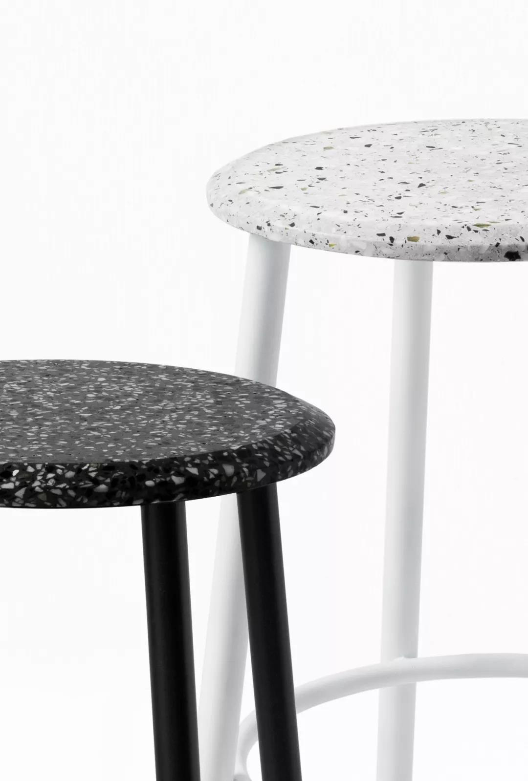 剩余的石材边角料与混凝土混合后打磨,形成经典的水磨石质感,呈现透气自然的机理,是旧时光的记忆。 从水磨石座面到金属腿部保持优雅流畅的圆,对称而恒定,一如你我的日常。 水磨石的复古花纹以摩登利落的风格在当代空间找到新的角色。黑白两种配色选择,给予厨房、咖啡厅、酒吧一种新的视觉可能。