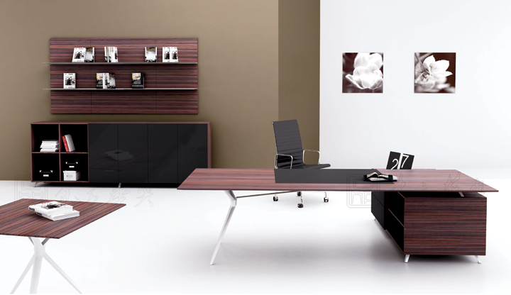 ※ 上图为班台局部细节展示,台面黑色皮革加天然斑马木,木析纹理和质感表现得更为淋漓尽致,色泽自然,以侧柜为另一支撑面,亮光不锈钢脚架支撑,款式大方新宜,以及佩带的颜色选择。