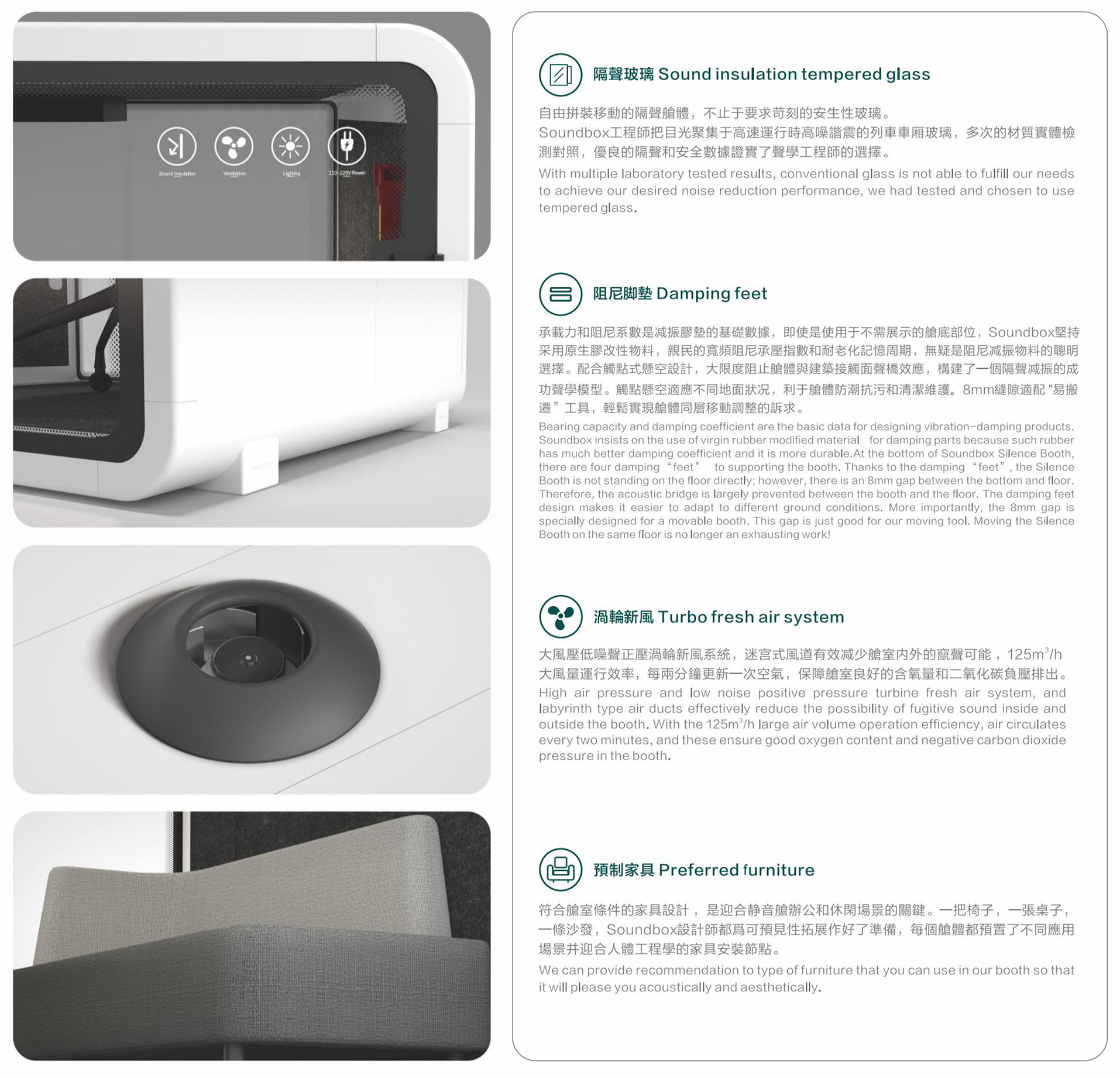 一个灵动的安静空间,满足您无限创想不传统的碳塑复合板、航空铝、隔声玻璃是它的主要组成,SOLIDWORKS软体力学建模让仓体组装仅需一种紧扣件,INSULMARSHALL ACOUSTIC 声学模拟设计准确预知并实现了舱体隔音和舱室音环境指标,它是一个强大,尽管它不是最完美的迷你空间,仓体采用可循环碳塑再生材料 SR系列 静音仓推崇低碳、简约、安全、实用主义优化非必要的功能和配置。从薄的全R角外观和互雅配色让它更精致、融入环境。