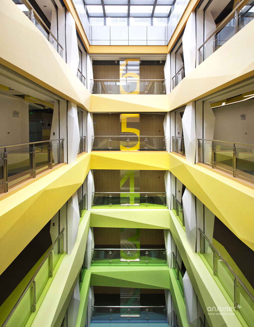 整个中庭为本案的亮点。设计师利用建筑的结构优点,并为了更好地展示出每层的特色,采用了腾讯文化中的几个主色调,不同的色调代表着每层的空间色彩效果。为了使中庭的空间感更为突出并结合设计理念中的造型元素,每层楼板外立面及柱体,都运用了立体式折线的效果。从中庭对应的一楼休闲区也设计了三组采用地球轴线组合而成的有趣的休闲讨论区,既有开放的效果,又有一定的分割隐私作用。