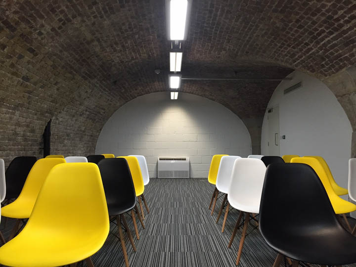 为了打造一个充满活力的企业家社群,内部空间被设计为可移动的模式以适应不断增长的企业需求。室内最为吸引眼球的建筑特色便是建筑自身的拱形天花结构,设计以此为空间布局并配以特殊的照明灯具,以彰显建筑特征。为了与传统的红砖拱顶相配,室内慷慨的选用1.2米宽的实木长桌为个人与团队合作提供充足的工作空间。